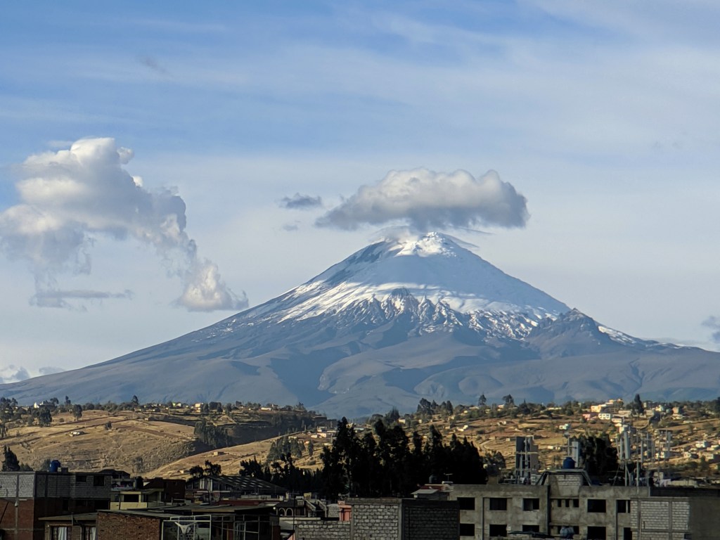 Finally the descent to Latacunga came at about the two thirds mark. It was much easier and nicer although the headwind made speeds slow (mostly under 70). Then it was just a matter of cranking out another 20 km or so, all into the wind, but slightly downhill. We ended up at almost exactly the altitude we started with – about 2,800m. I didn’t notice it being harder to breathe climbing at 3,500m – it was hard all the time. For the last few km I got to tuck in and draft behind Rob and Luccho which was great. So much easier and faster. We found the hotel and I was really surprised how nice it was. Our room is great but what was really cool was the snack provided by Bike Dreams, soup, bread and other stuff. We had excellent showers, did laundry and had hours to relax before dinner. Seems like a great life so far. How will I feel after two more days a little harder than this one?