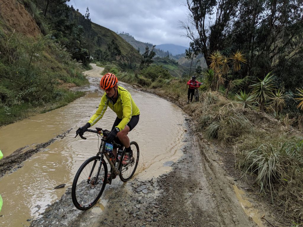It started raining soon after I started up again and the descent was challenging – the rain drops felt like needles on the exposed parts of my face. I couldn’t feel anything on my legs. Around km 58, it all got better. We turned off the Pan-American Highway onto an unmarked dirt road which is a genius move from Rob: this road cuts off about 12 km and saves something like 500m of climbing to Loja! Also it’s got little traffic and is SUPER scenic, and IT’S DIRT for 30 km! It was still raining and somewhat muddy but that did not detract. The mud was actually packed by vehicle tires in a great way – it was very secure and you could go fast.