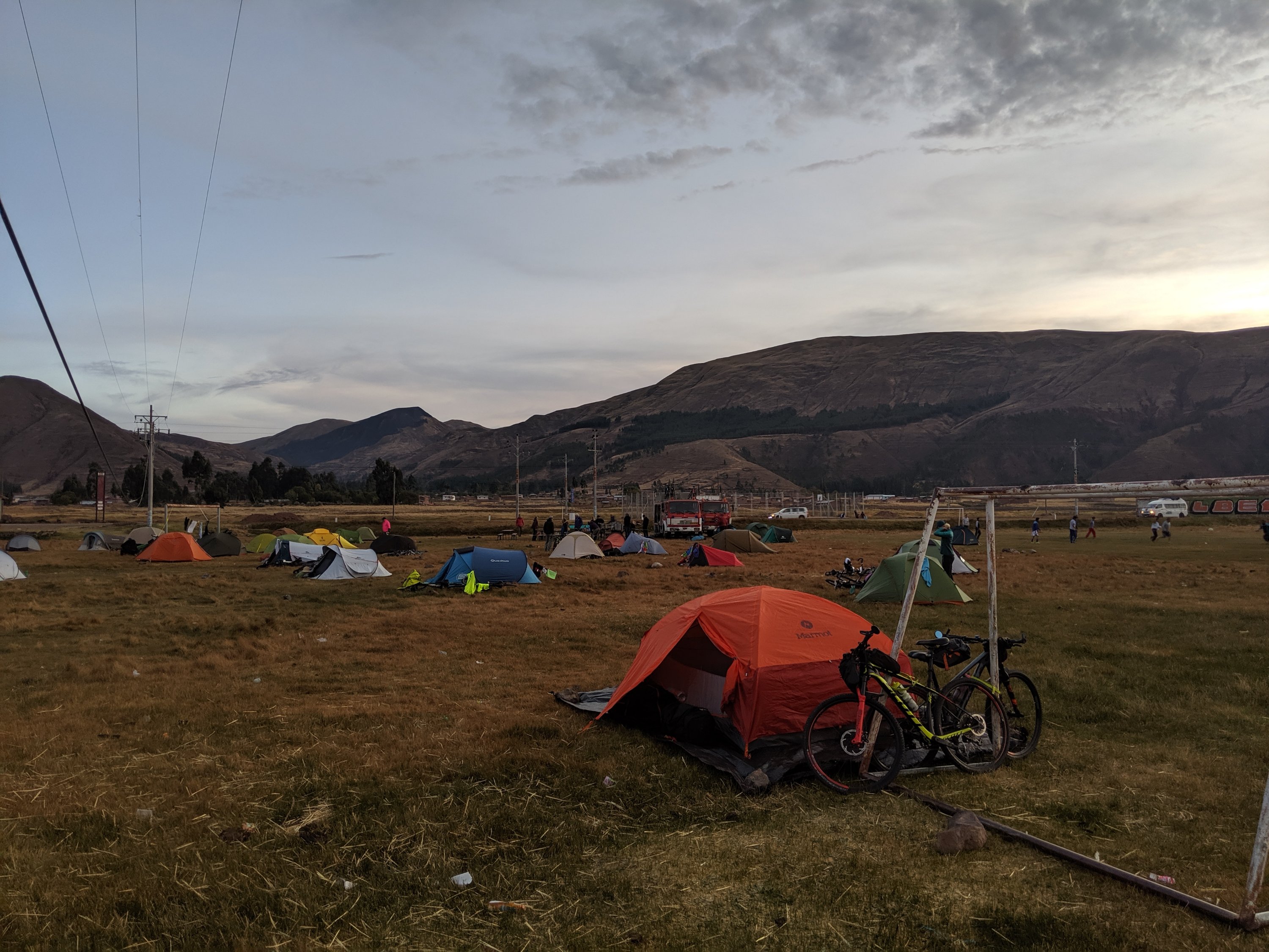 I took it easy, stopped for food at a lake around 40 km, then met everyone at lunch around 60 km. I rode with Andrew and Jan after lunch and although it was about a 60 km climb, the last part was very gentle and we made it to camp no problem. It rained a bit on the way but just for a little while. Camp was by a soccer field, right next to another set of Inca Ruins. The main attraction there for our crowd seemed to be the public toilets – much better than trying to find privacy by the soccer field. Villagers were everywhere too, tending crops and watching.