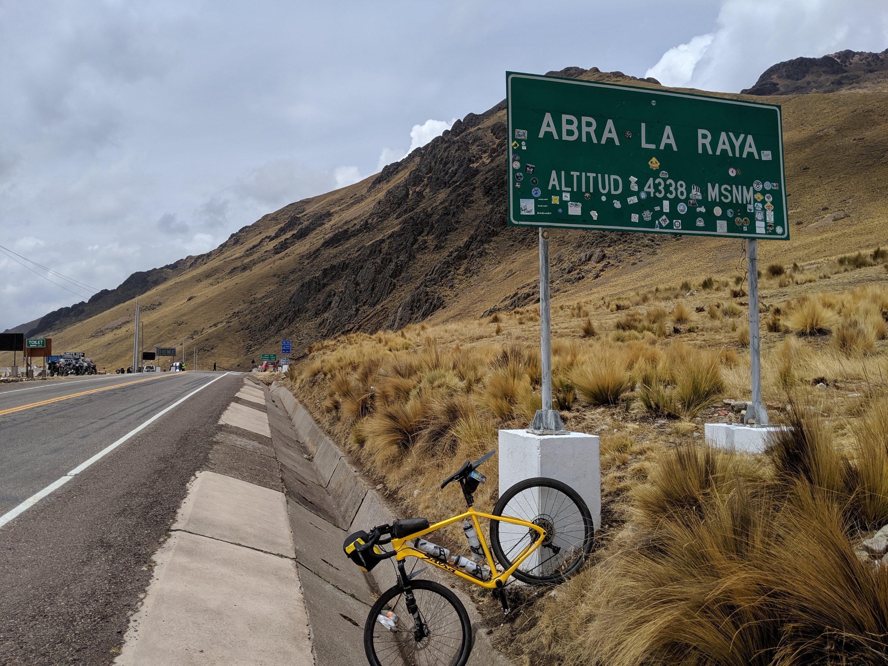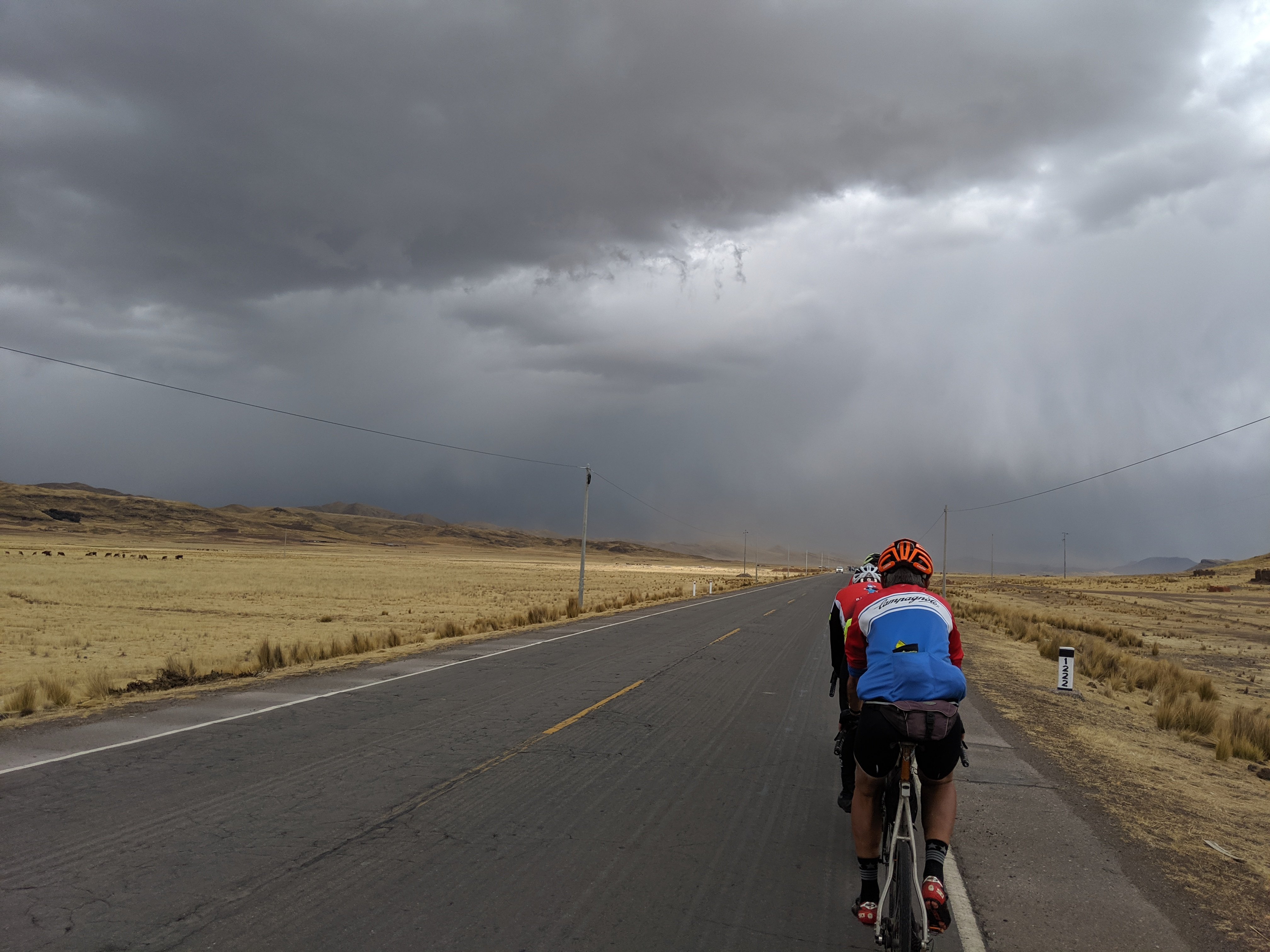 It took some patience and balls but we made it out without accident, and then continued along the road to Puno. Now at 75 km, we still hadn’t seen the lunch truck. We stopped and ate the food we had, then maybe 10 more riders pulled in doing the same. I gave my last bar to Kirsten who had already eaten the six she had and was still having a calorie crisis. We left first and after 4km found the lunch truck with Wijnand, Rob and Guillermo sitting quietly at a decent spot by the side of the road with lunch all set out. So we had lunch, then took off for the last 32 km. It was boring and flat until the hill at the end. Bastiaan had caught us with Lambert and we cruised up to 4,000m again, took some photos at the top, then headed down to the hotel.