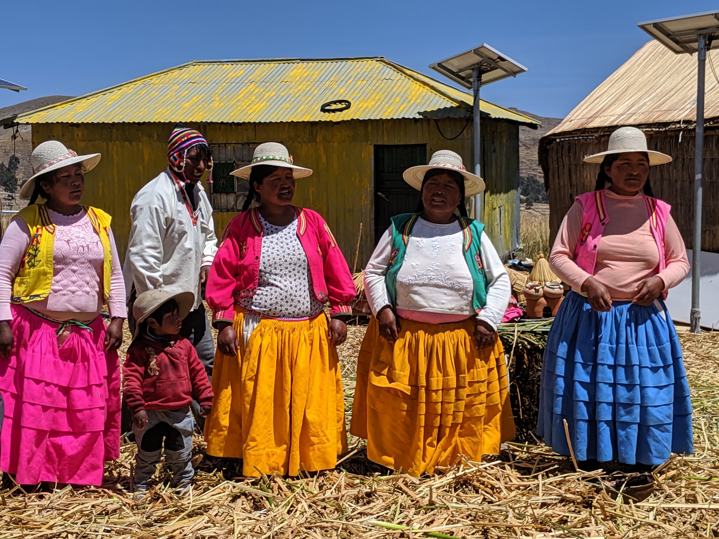 We had a really enjoyable rest day yesterday in Puno. A bunch of us signed up for a boat tour of the famous floating islands of Uros in Lake Titicaca. They picked us up at 9 and drove us 1 km down to the dock where we boarded a little boat with a few other people. We headed out and soon were in a channel between reeds (the famous ones that the locals use to build boats and their floating islands). After a little while we got to an area of water surrounded by floating islands. We landed on one and our guide introduced us to the locals who live there. It’s about 2,000 Peruvians and over 2,000 Bolivians. Each island supports about four families, so maybe 20 people. They showed us how they make the floats from the reeds and how they have to replace the top layer every 10-15 days. It turns out that ALL these people living out there have only one industry: tourism. They make trinkets and sell stuff to people like us. They sang songs and the President of the four families on our island showed us how they build the houses, the cell towers, etc. A lady showed us the inside of one of their houses: very small, welcome to the 3rd world for sure. They tried hard but barely any of us bought anything I’m sorry to say. I did spring S10 for a ride on their “Mercedes Benz” boat over to another floating island, where Greg, Michael and I had some beers and relaxed for a while. Then it was time to go back. The air is clean, as is the water of the lake. It’s about 20m deep there and the thickness of the floating islands is 4-5m.