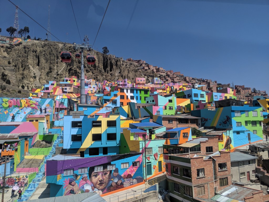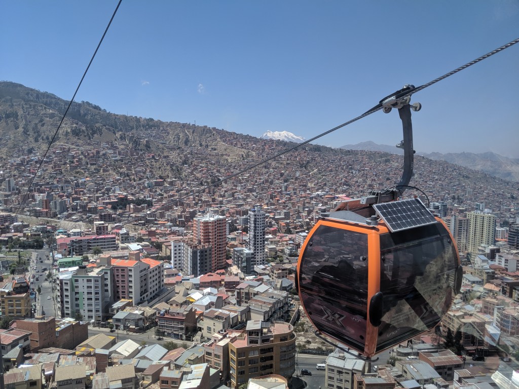 It was really nice having two full rest days in La Paz, the last two days of September. Especially for me since my cough has gotten worse lately – I needed two days of not breathing hard to recover. The first morning was a Sunday and eight of us went on a cable car tour of La Paz after breakfast. We walked over to the Estación Central where two of the many cable car lines start. We chose Red first since it went uphill – we had ridden under it the day before descending into La Paz. The special tickets that let you go on all the lines for 24 hours (no more than one hour stop at any station though) cost BOB 11 ($1.59). Such a deal! The system is built by the Swiss and once you’re inside a station or in the cable car itself you don’t really feel like it’s Bolivia. It’s so modern, clean, fast and efficient. We rode up to the top, switched to the Silver line, rode for a few stations, had ice cream/coffee/pastries at a coffee shop with a panoramic view of La Paz, from 4,100m. Then we took the Yellow line down to below the level of our hotel. Then Blue one stop to downtown, then White through the middle of downtown to Orange, up and over a hill and back down to Estación Central.