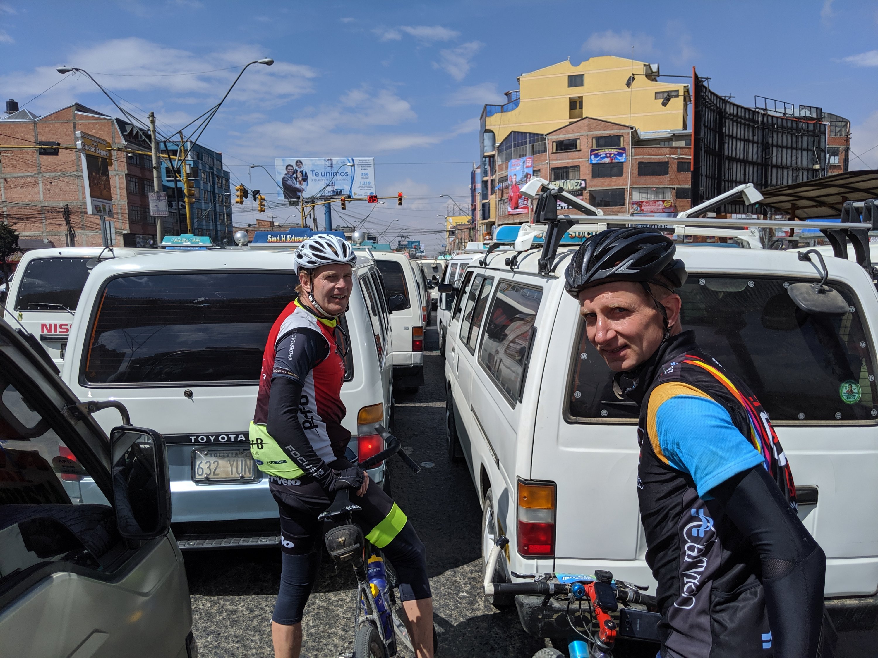 I felt so much better the morning we had to leave La Paz – also drawing the late breakfast shift (8am, because the dining room doesn’t come close to fitting us all) was great. We took off just after 9 and after just a couple of blocks, more than half the people headed off to the Purple cable car line. The rest of us followed the GPS track down to the start of the motorway, then 10 km up to 4,100m (which turned out to be uncrowded and easy), and through El Alto for a long way until we were out in the country again. The cable car group had a great time bypassing the big climb and quite a bit of El Alto screwing around in super heavy traffic. But the EFI group got smaller: Jan kind of took the cable car by mistake and Karin took it due to sickness. Rob’s opinion: “There is a plane to Ushuaia for those that don’t want to ride.”