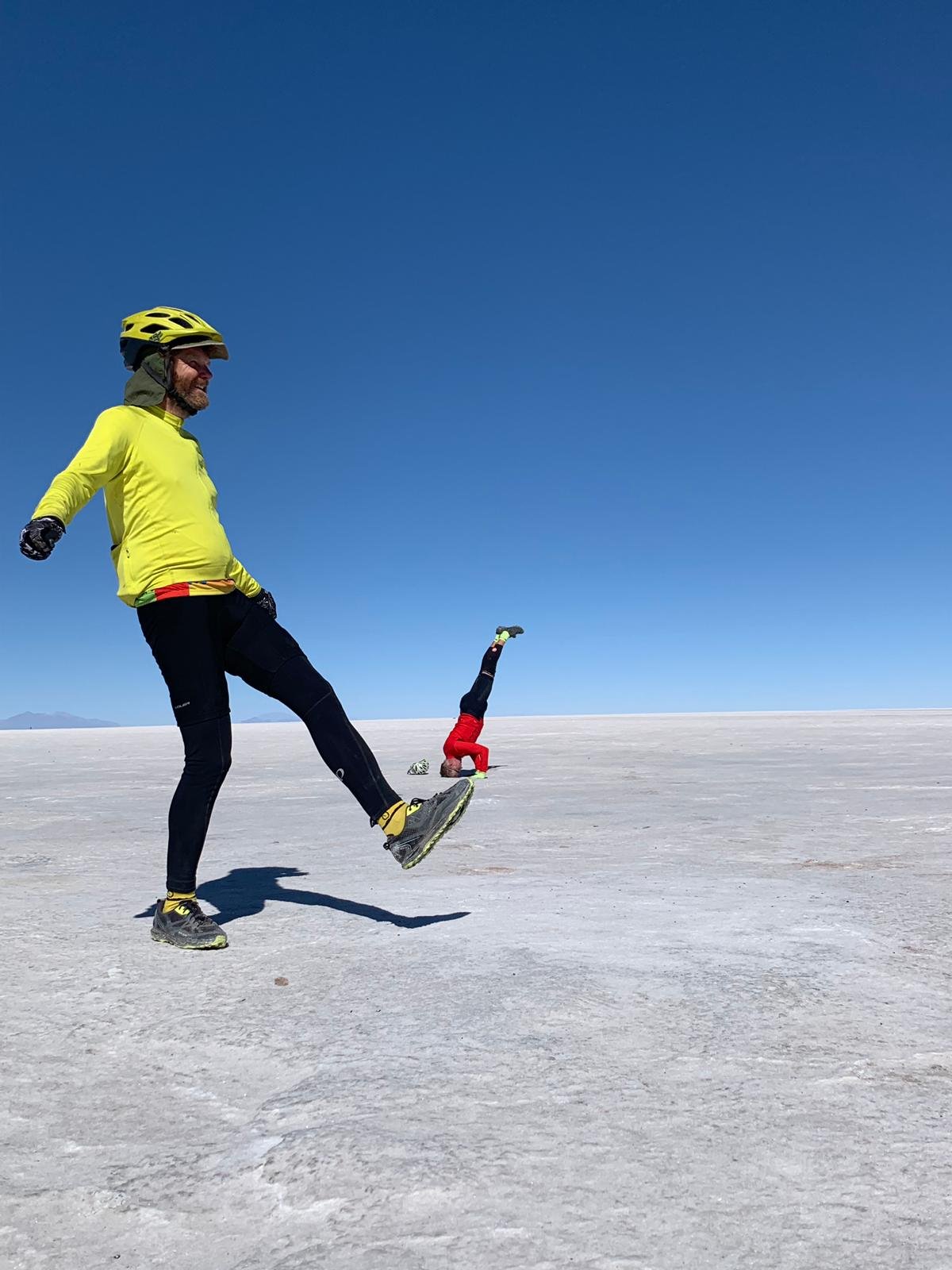 In the morning, we had the luxury of an 8 o’clock breakfast. It was the normal Bike Dreams muesli with yogurt and bread with jam, pb, etc. We had to wait for a truck to come and pick up our baggage so we headed outside and took a bunch of funny perspecive shots out on the salt.