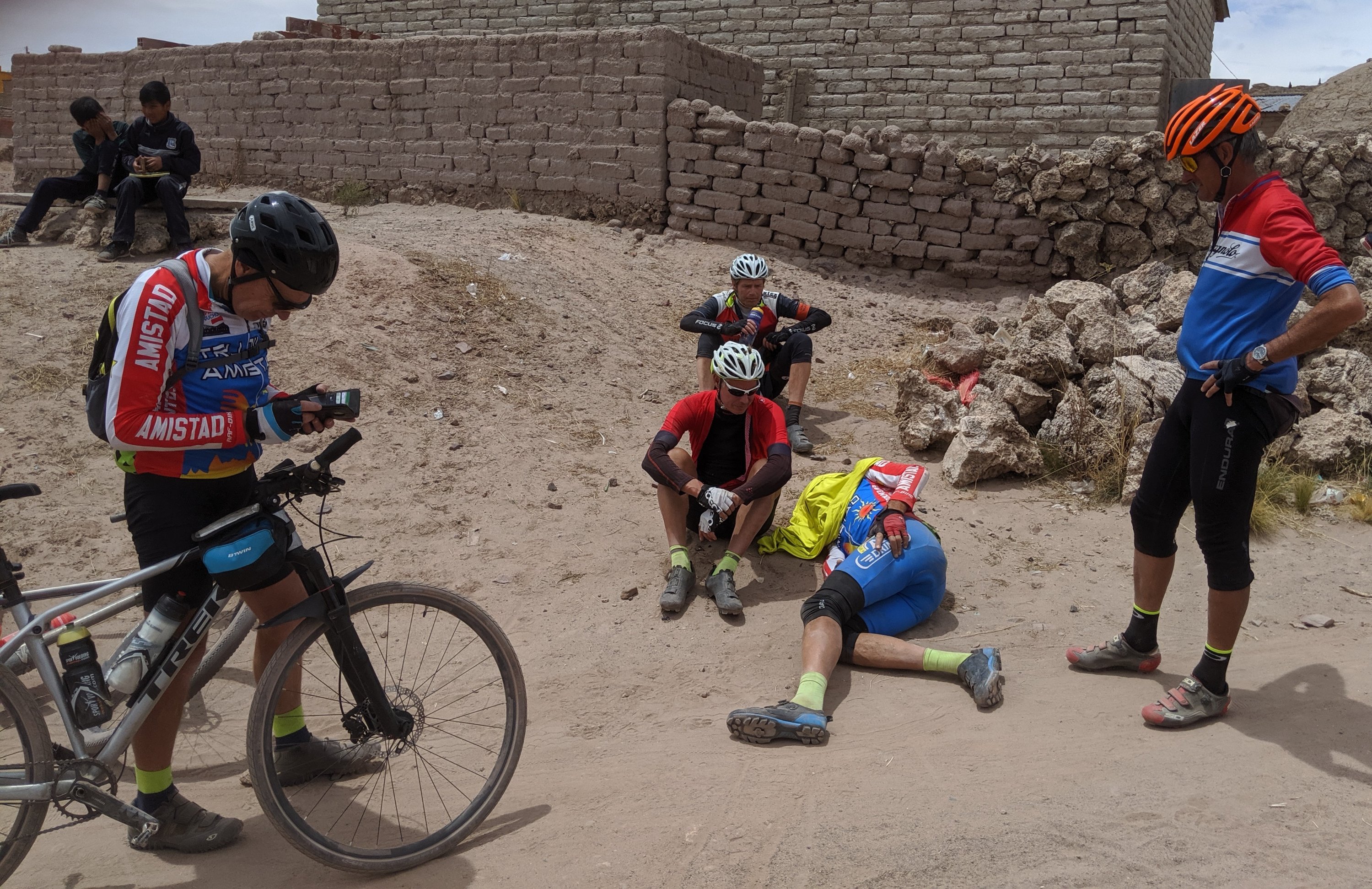 The two villages are 8 km apart and maybe 3 km was rideable although some of that is sitting back a bit to float the front wheel and turning a low gear hard with the bike sliding along randomly going left or right – takes quite a bit of energy. Luckily we are acclimated to the 3,800m altitude and have strong legs. For a normal person from sea level it would not be fun. Finally we could ride and did a couple of steep climbs into Aromas. We passed a covered soccer field, then at the bottom of a hill, saw Wytze and Jens sitting next to Chris, down and not moving.