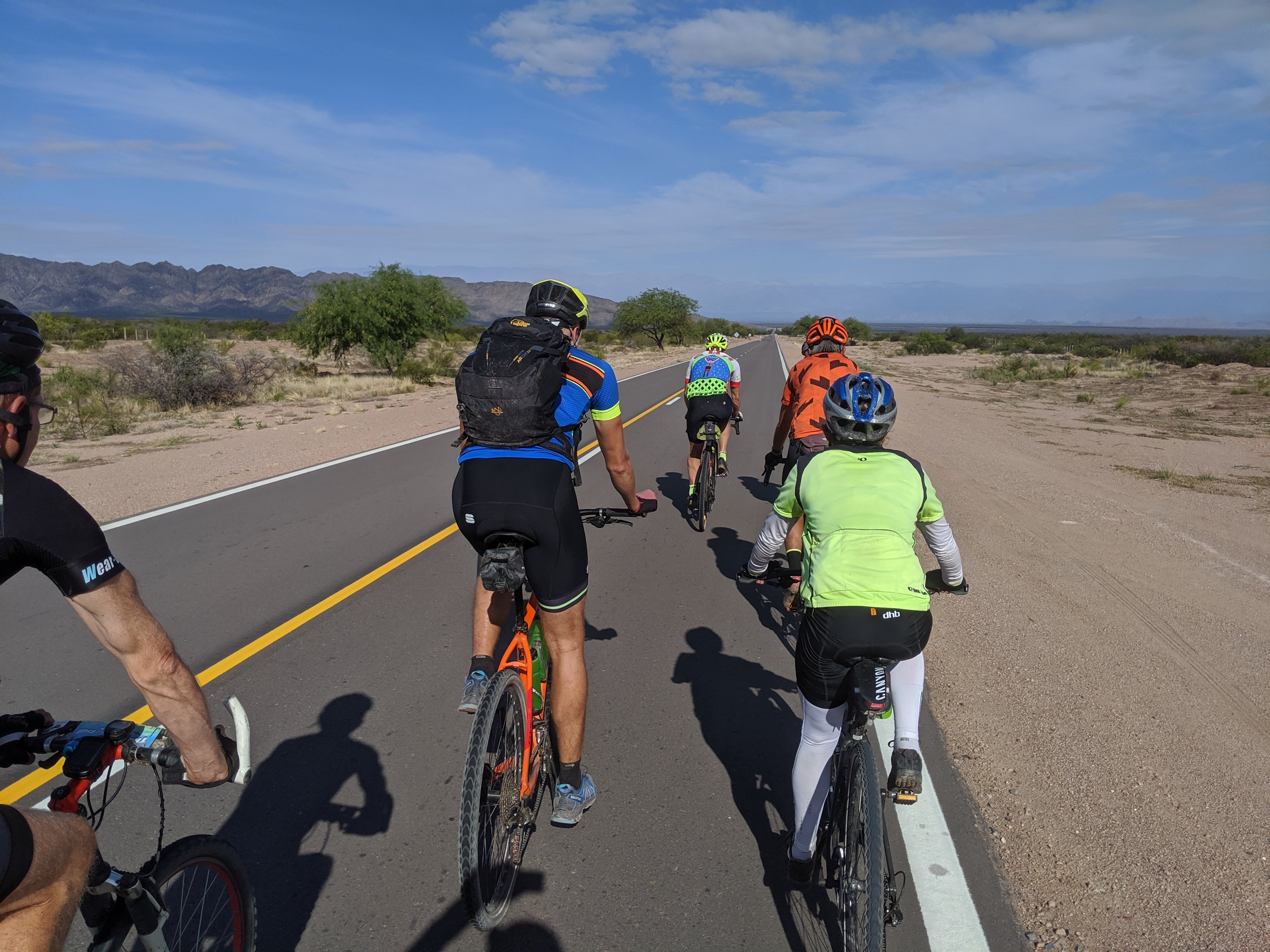 We headed out from Santa Maria at 9:15 and cruised south on Ruta 40. For the first 40 km we were in a large group with Wytze leading one line and me the other. More and more people dropped off as he kept ramping the pace. Finally I had had enough and had my own little group of five or six, with me and Twan pulling the whole way. We received profuse thanks at 65km when we got to lunch. It was out in the middle of nowhere, no shade but luckily not too hot. The winds were not bad either. After lunch it did get a little worse and Twan and I just carried on the two of us, stopping for photos and enjoying the ride. Ruta 40 is the classic road through most of the length of Argentina and we know this part pretty well.