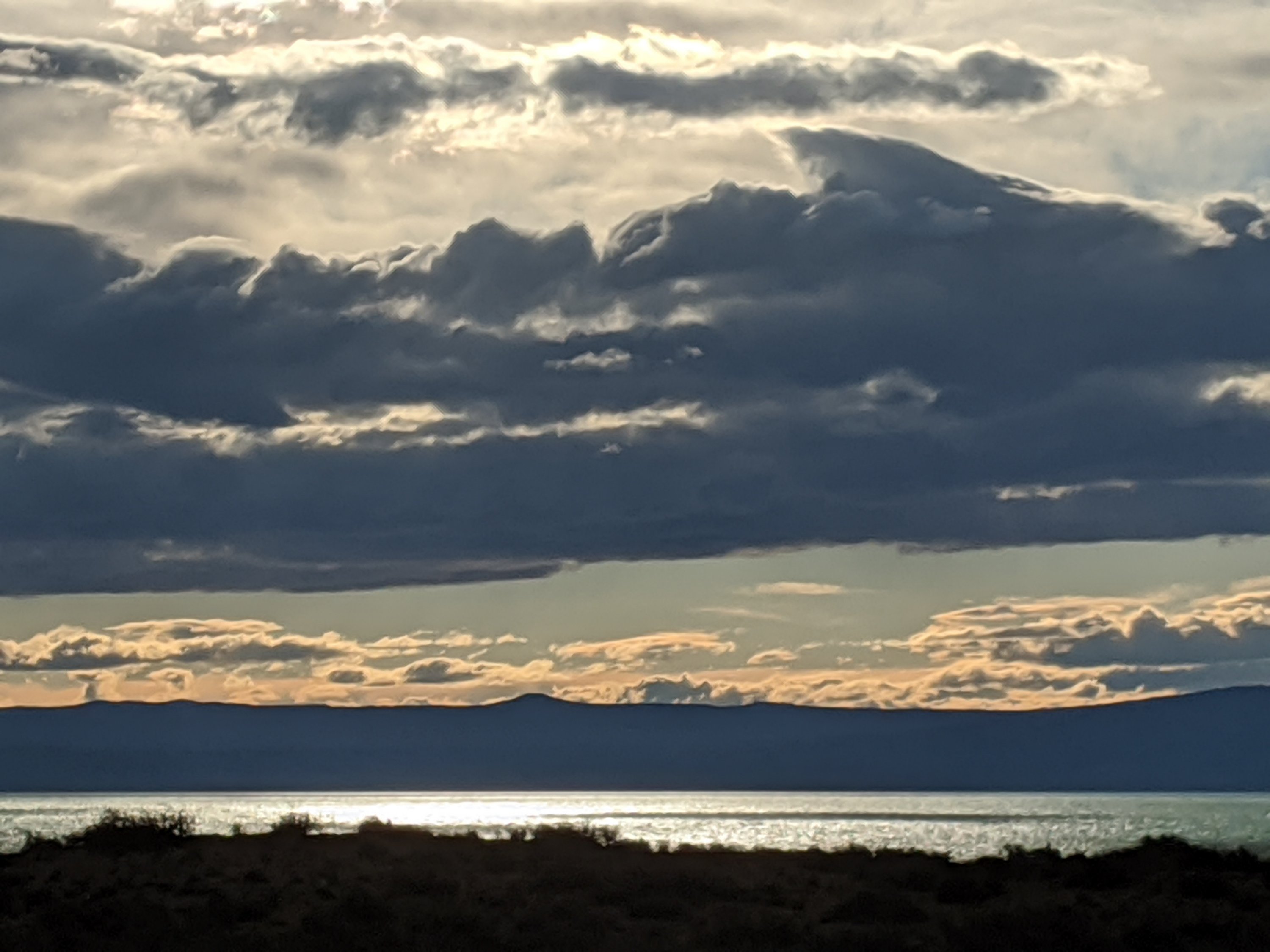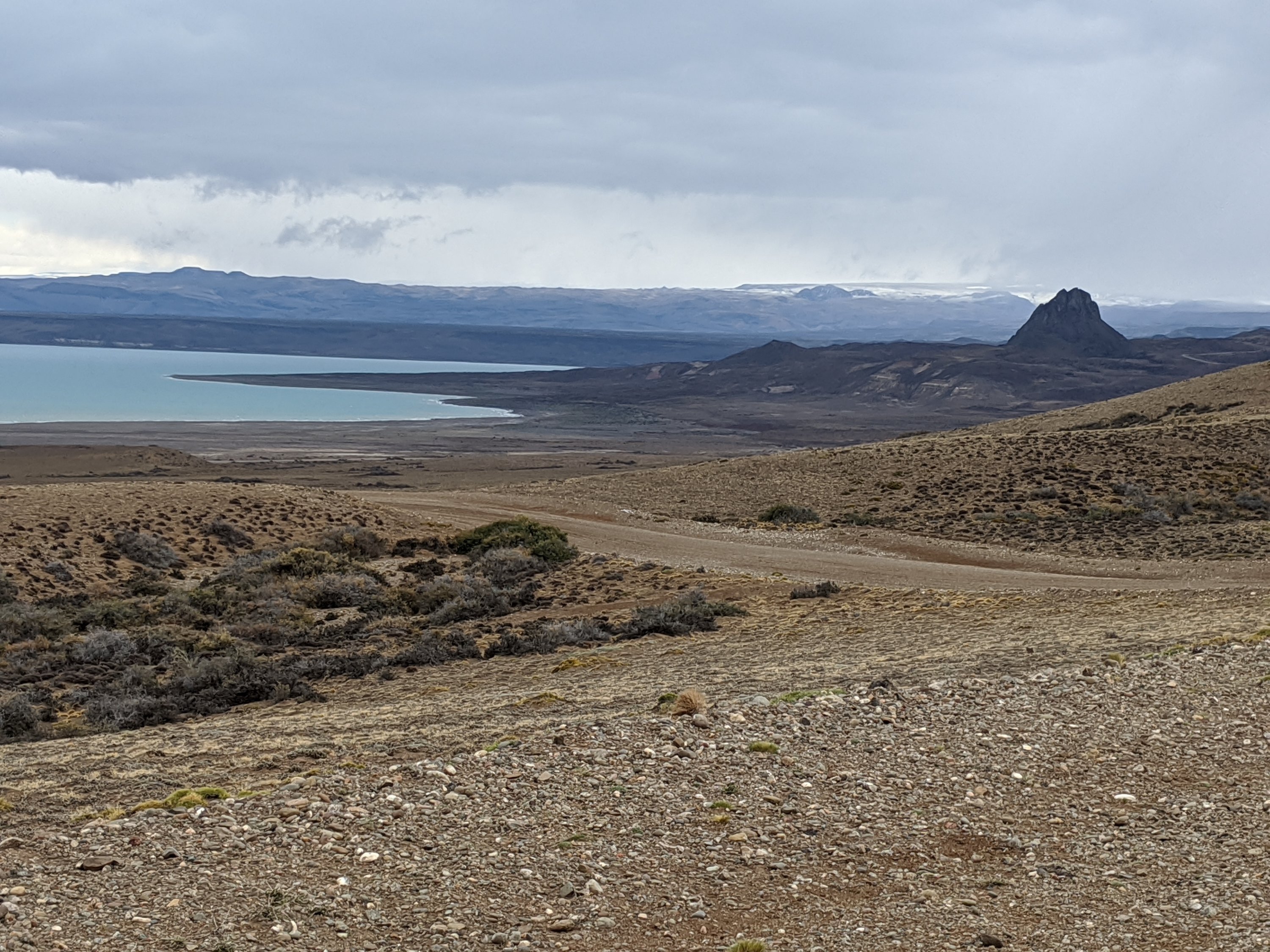 For the second time on the tour we ate lunch in the cab of the truck as it was so cold and miserable outside. My plan was to have a banana only but I ended up having a full lunch and staying 20 minutes. I continued up the road, into the wind, now getting muddy and really crappy with the rain. But just a few km up, the rain stopped and because the wind was so strong (I was going at the amazing speed of 10-11 kph), it quickly dried out the mud. I could see Andrew’s track slithering through the mud – he was only a little ahead but had it much worse. I climbed over a little pass, then down to Lago Cardiel, where our camp was located.