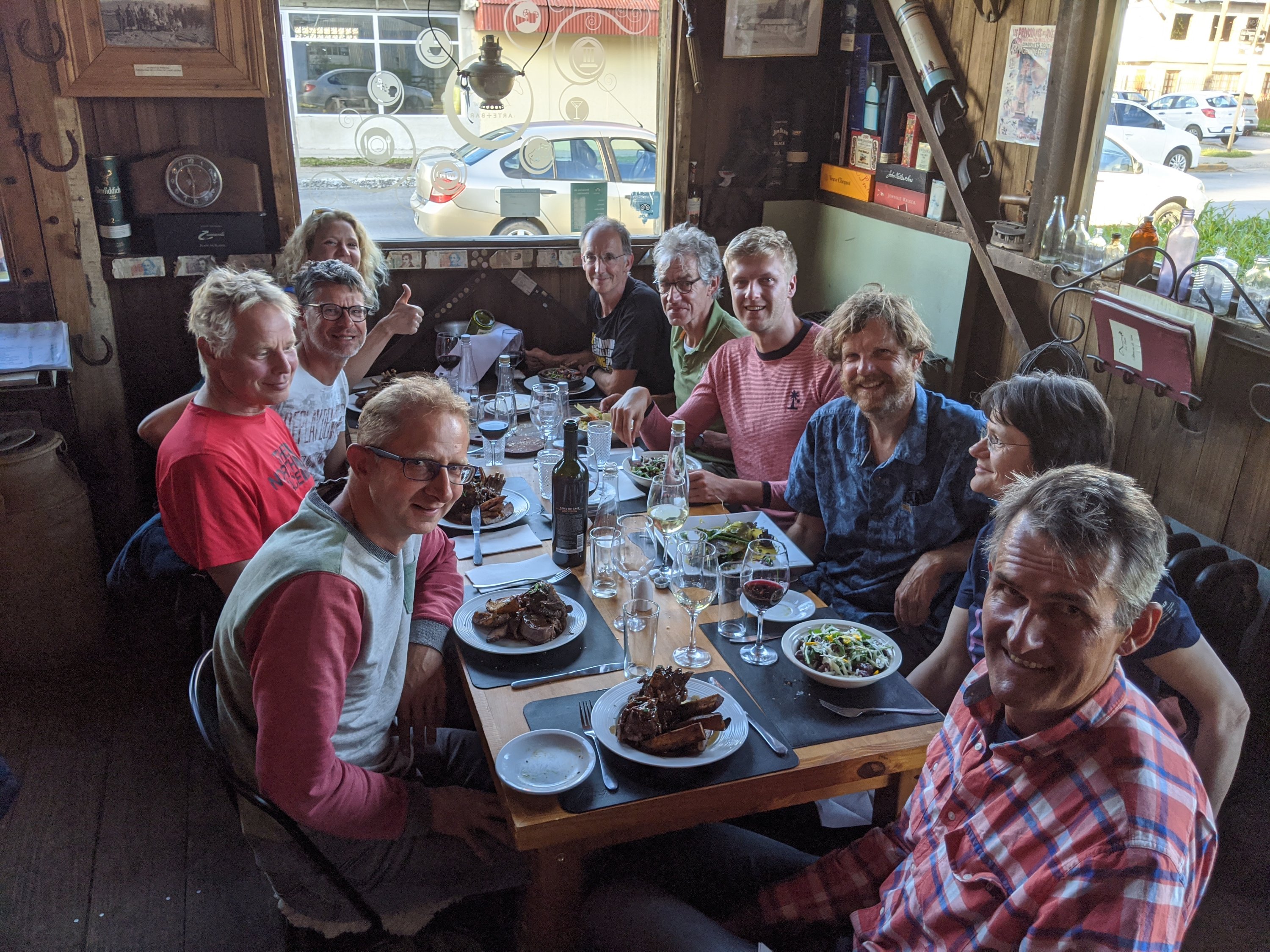 We had lunch in a shed, used the gas station wifi, then started on the way to the Chile border, along a paved road, into the wind. We had a pair of rotating four-man pacelines, and boy did you suffer when you were in the hot seat. It was incredible how hard you needed to press on the pedals to maintain a decent speed (typically 11-16 kph). Finally after much riding, we reached the Argentine frontier and got our exit stamps and ate all our food. It was about 8 more km to the Chilean frontier, over a small pass, of course into the wind. Getting into Chile took longer but eventually we were through and camped in the border town of Cerro Castillo. I thought I was slow riding nearly 6 hours out of 7.5 hours, but others took 10 hours and many (I think most) did not complete the ride. The campground was very basic, at someone’s house, just one toilet/shower to share between 40 people, nice grass for tents, and very windy. Charlotte and Bill kicked ass and made a great dinner for us and after, some of us walked “downtown” to find a cafe and ended up in a hotel bar.