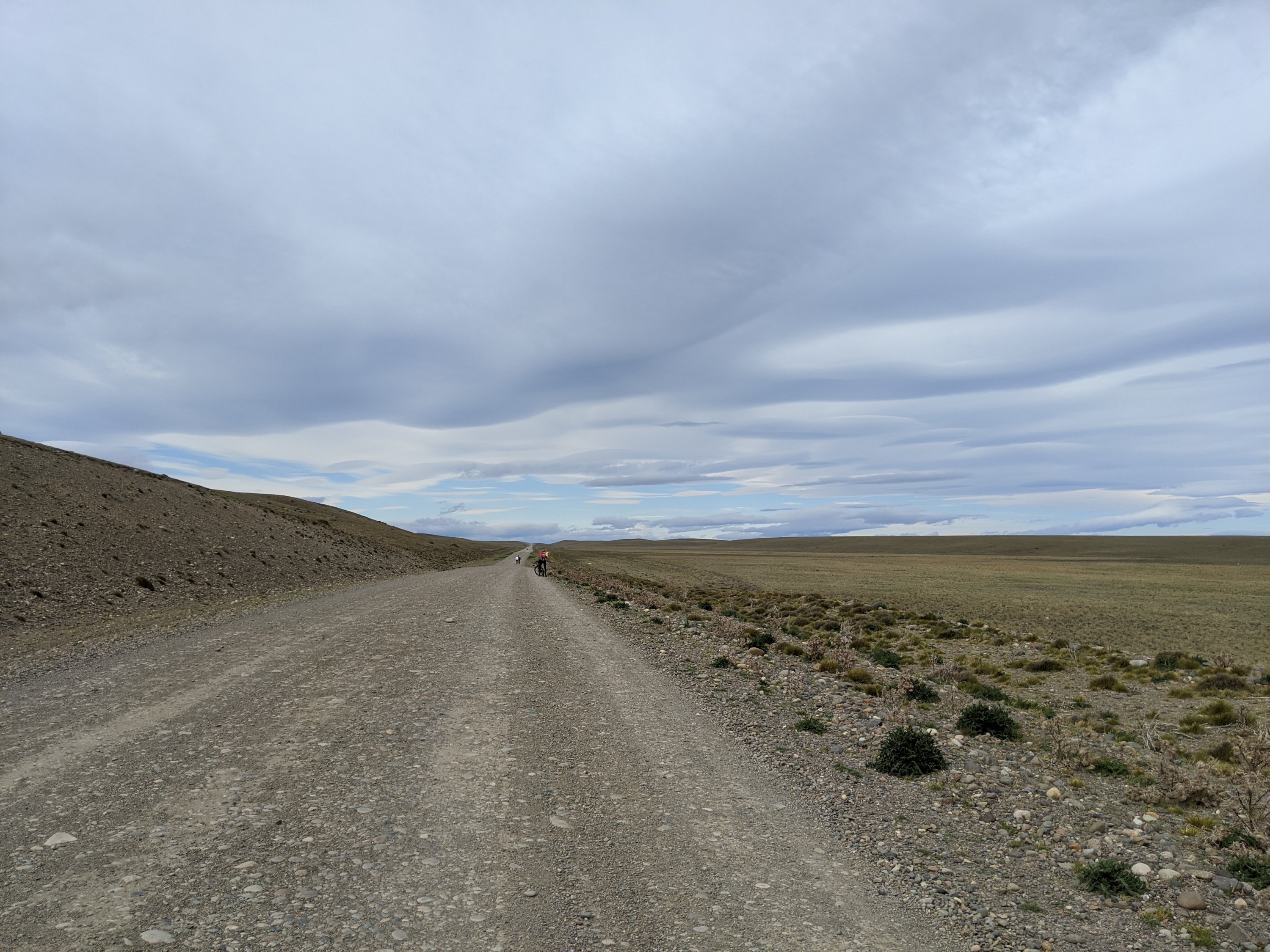 It turned out that the day we stayed in camp was very very windy, although sunny, and riding the planned 90 km into the wind would’ve been very tough, maybe not possible. The next morning, December 6, we did exactly that, with the wind a little reduced, under cloudy, cold skies. It was still really tough just to get to the gas station at the end of the dirt road. It took me 2:32 to ride that 31 km and it felt like forever. We drafted as much as possible but the road was very rough making drafting dicey.