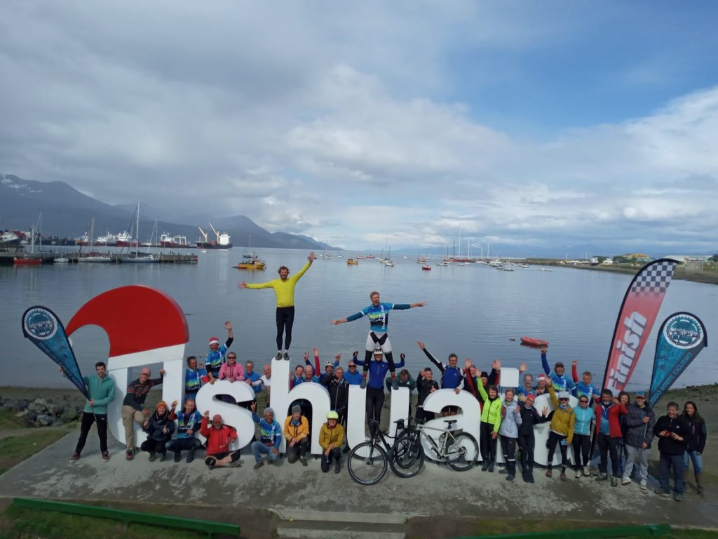 I was expecting the Finish Ceremony to be at the classic “Fin del Monde” sign downtown but that area is more built up now and the trucks can’t get there. Instead we stopped at a giant new Ushuaia sign at the waterfront. There was a giant finish arch, music playing, champagne and many many snacks. The champagne was served by Kees who had left us in Cusco but came back with his wife for a trip to Antarctica. He looked great and I really wish he had been able to ride the whole way with us. There were so many congratulations and hugs, it was awesome.