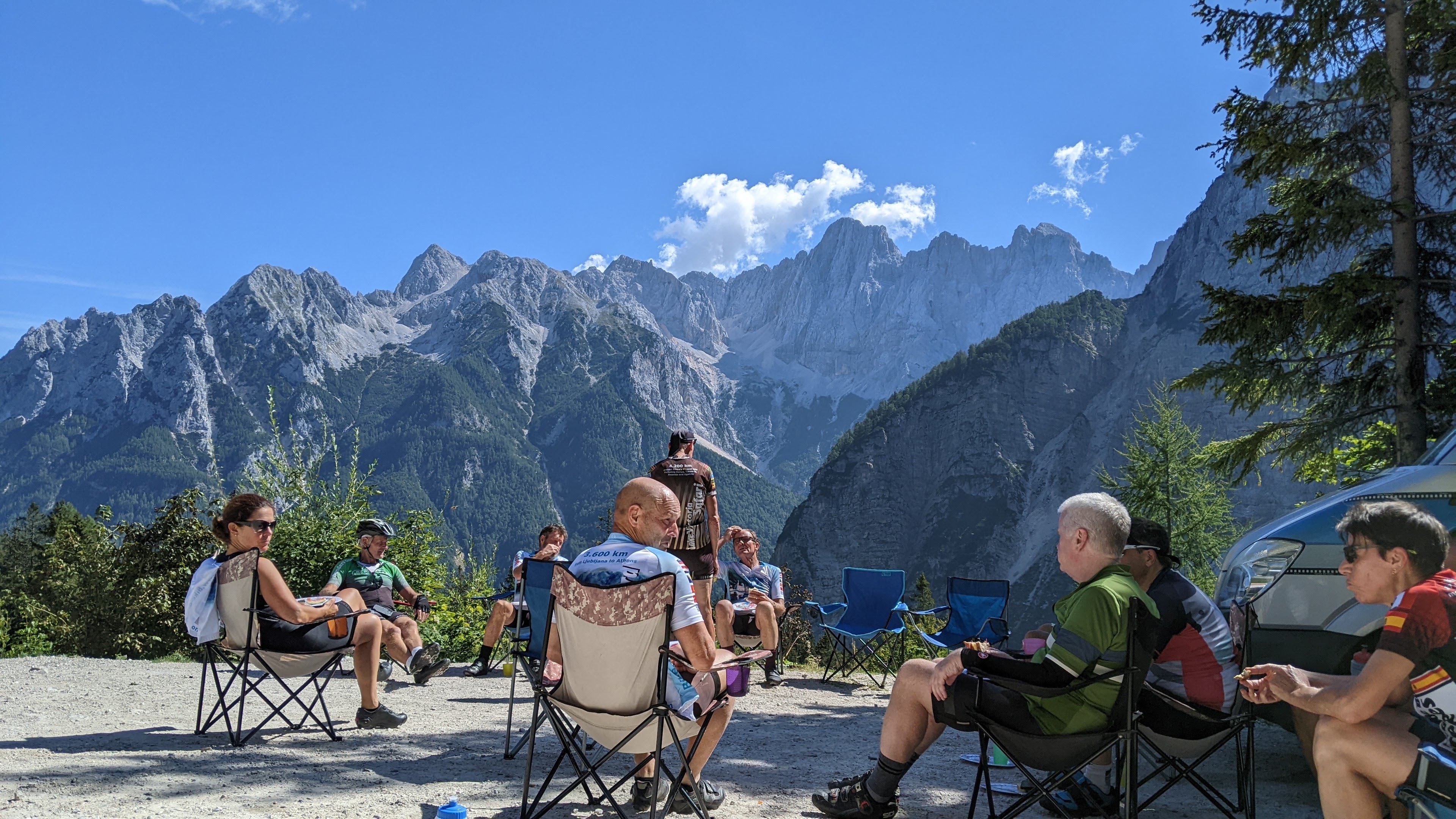 The descent was nice but comically crowded. I first passed a couple groups of 15-20 bicyclists, then two groups of 10 motorcycles, a bus, several cars and camper vans. Even with no one in front it was too steep to ride very fast. After the descent there was about 20 km to go, mostly downhill with a couple of little climbs at the end. The camp in Bovec is nothing to write home about, but not bad. Various people went out on beer runs. We had some delicious pepper/cauliflower soup and tons of snacks. Eventually hot showers happened and I scored a pretty nice tent spot.