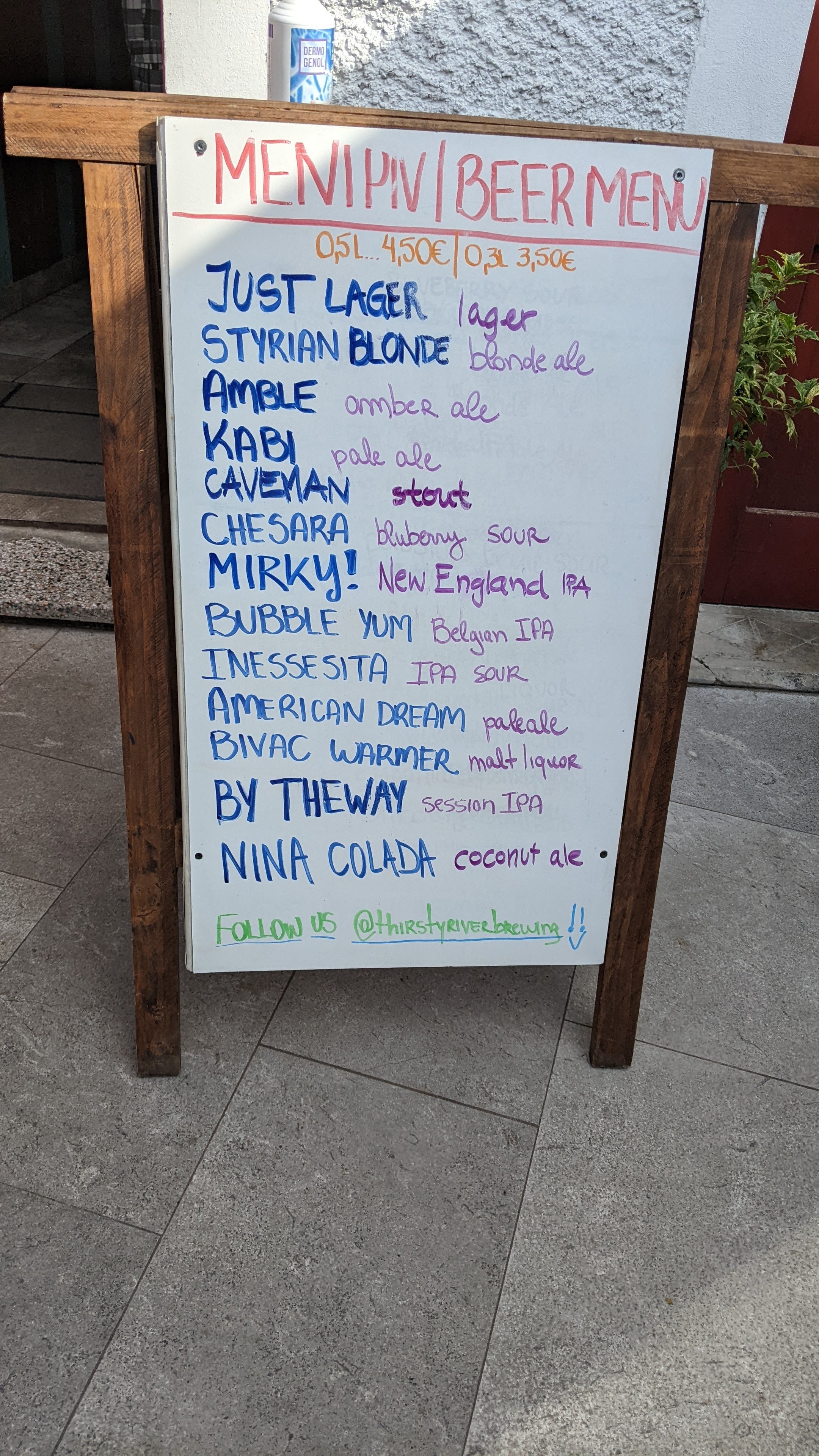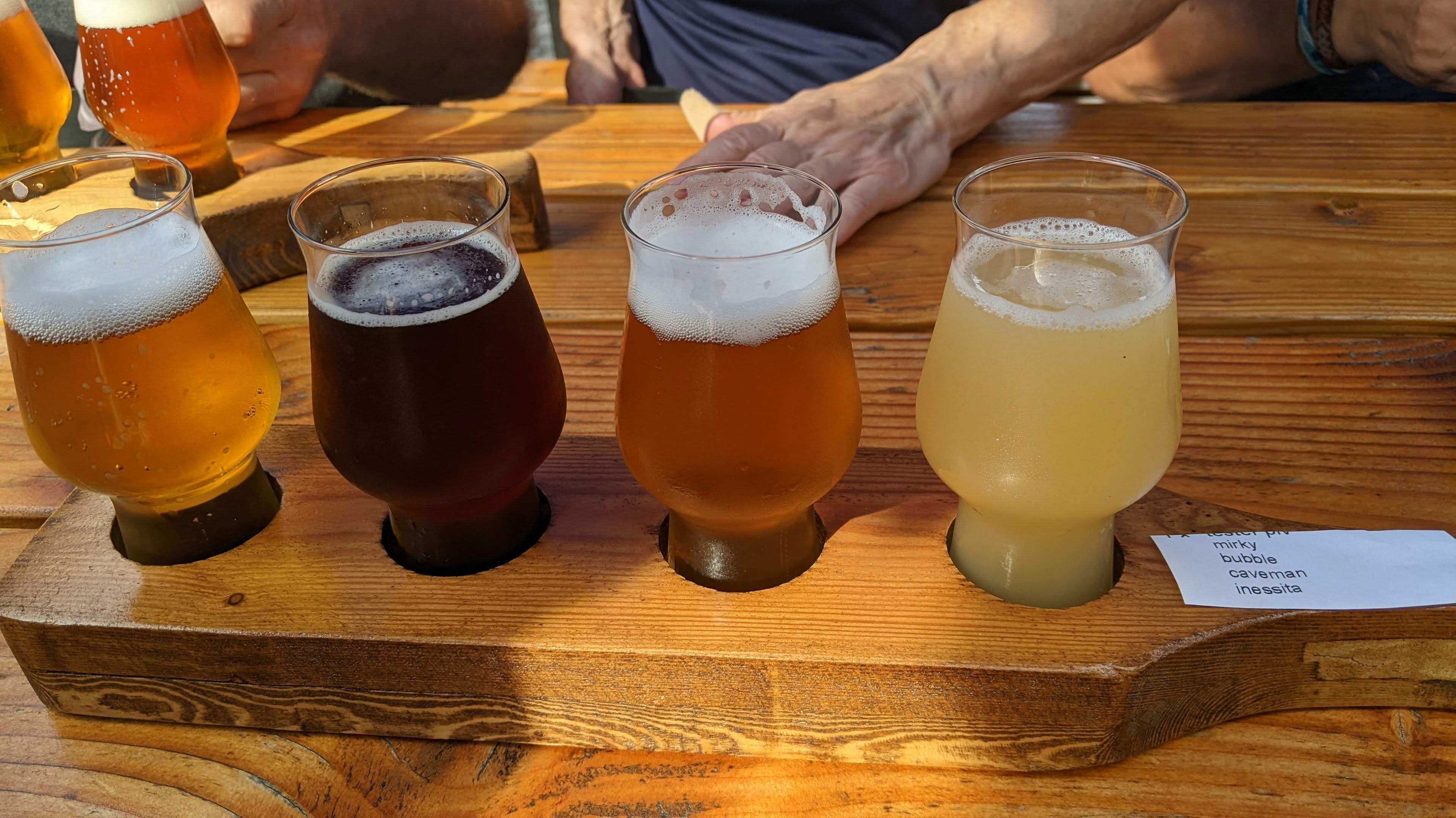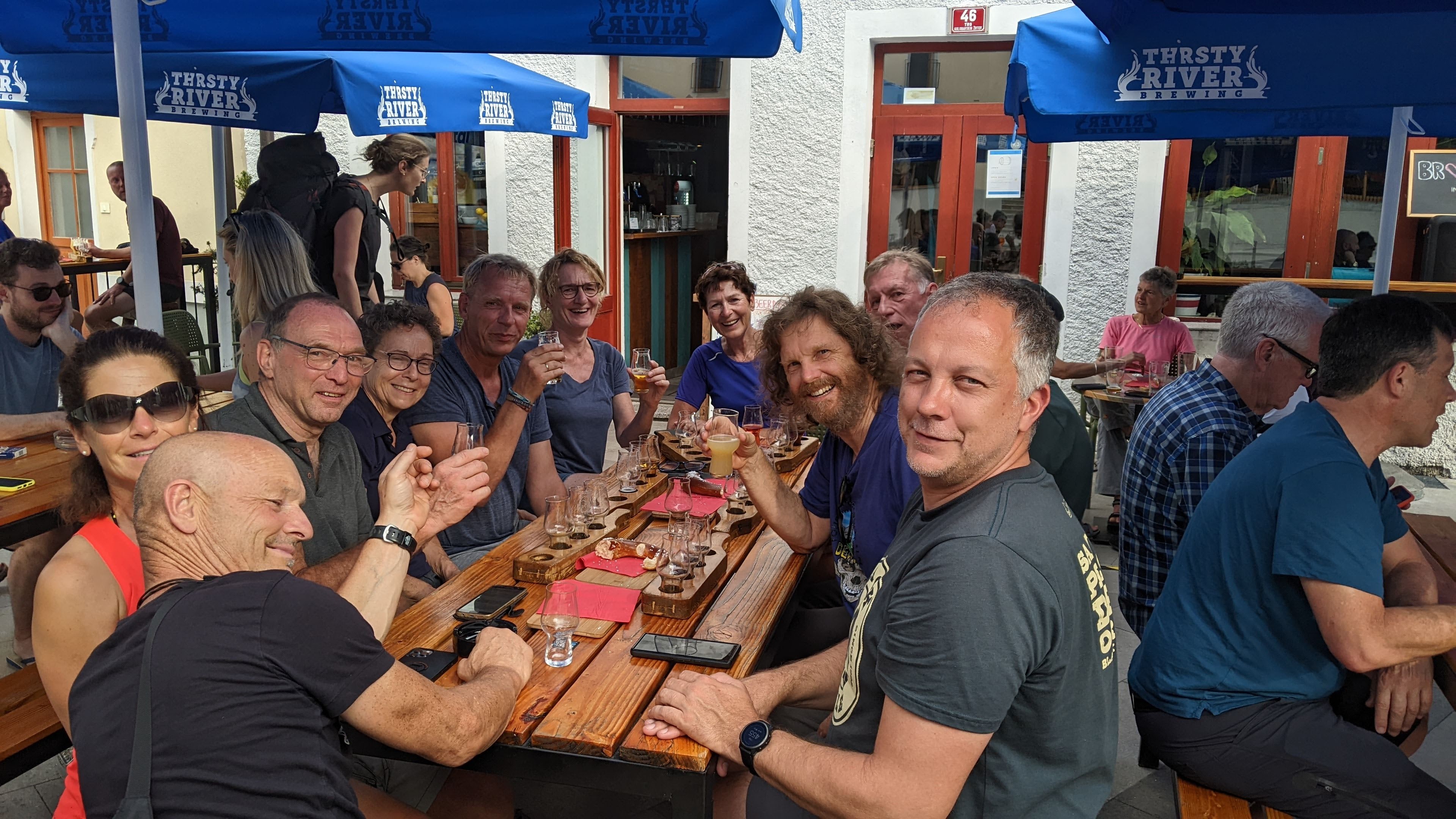 After breakfast I walked “downtown” and did a little shopping, did my laundry, read and passed the morning very nicely. By lunch time everyone was back and we enjoyed a double meal of lunch plus soup. In the afternoon, not much happened, but we did make it to the Thrsty River brewery by 4. Bob and I had planned to meet there but when I showed up with 6-7 others, he was already there with 6-7 others. So we had a grand Bike Dreams party, sitting outdoors, most people opting for 4-beer samplers. I had a great NE IPA called Mirky, a stout, a “Belgian IPA” and a “Sour IPA”. And pretzels and more beer, so fun.