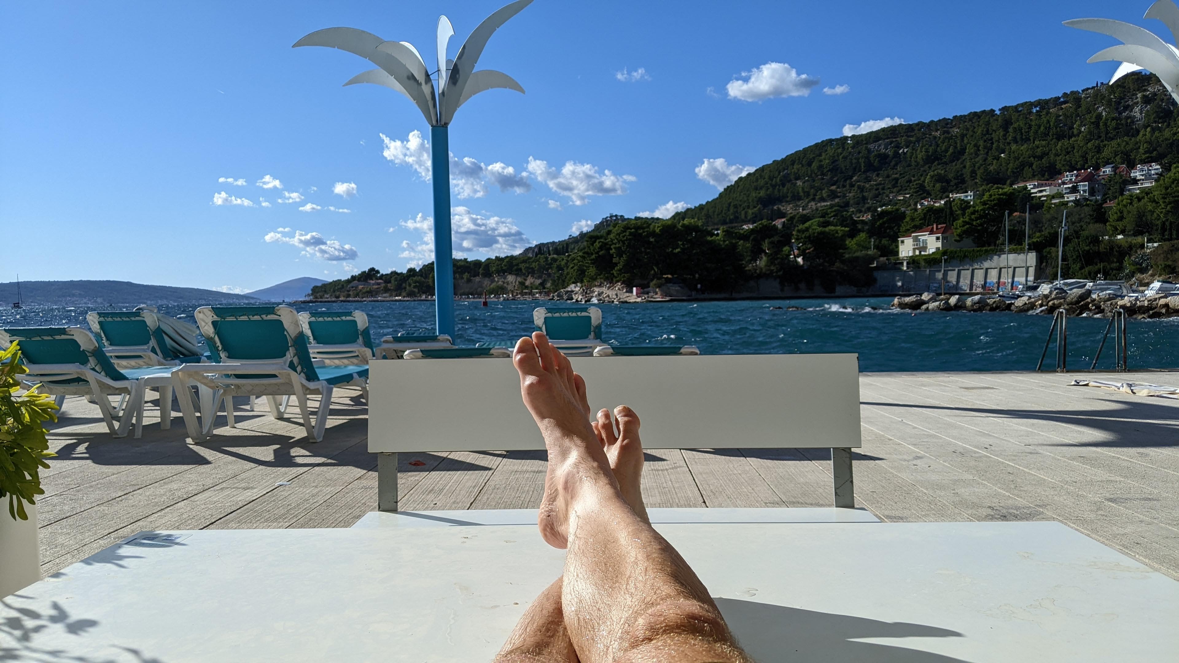 I walked back to the hotel and had a chat with Katie, then went swimming at the public swimming area next door – right in the Adriatic. The water was pretty warm, with choppy waves. It’s very salty so you can float really easily. The swimming area is great with showers and comfy shaded deck chairs – I relaxed for quite a while.