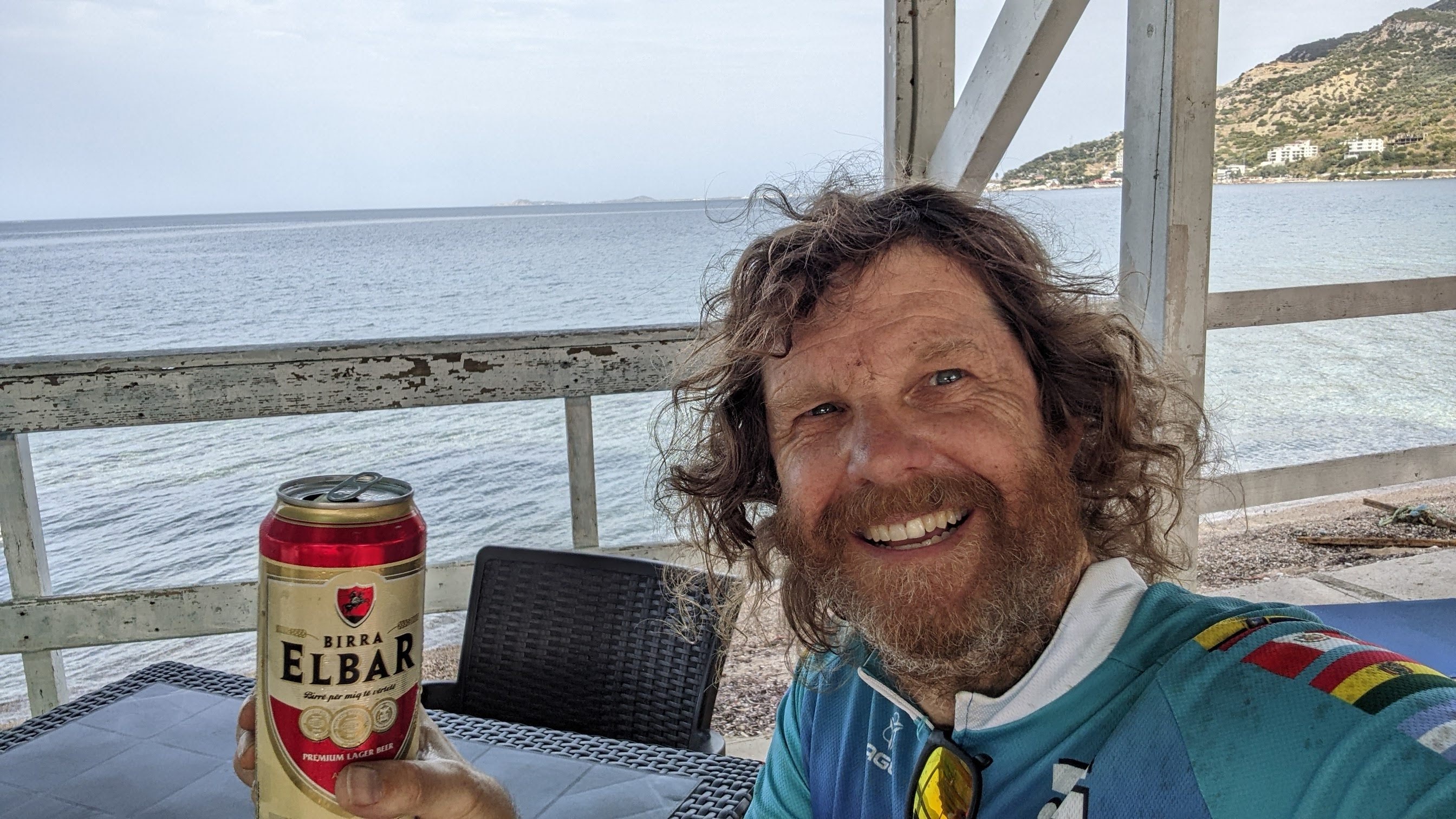 Soon I was getting near the end, riding through the beach resort town of Vlorë. I don’t know if this is for real but we always talk about the Albanian Riviera – this is it. Simo caught me 5 km from the campground. He has Covid and it was a big effort for him to do the whole ride – tough guy. We finished together to find no one and no trucks at the campsite. I bought us drinks and we sat outside in the nice breeze watching the water, glad the riding was over. It was only 11:40am.