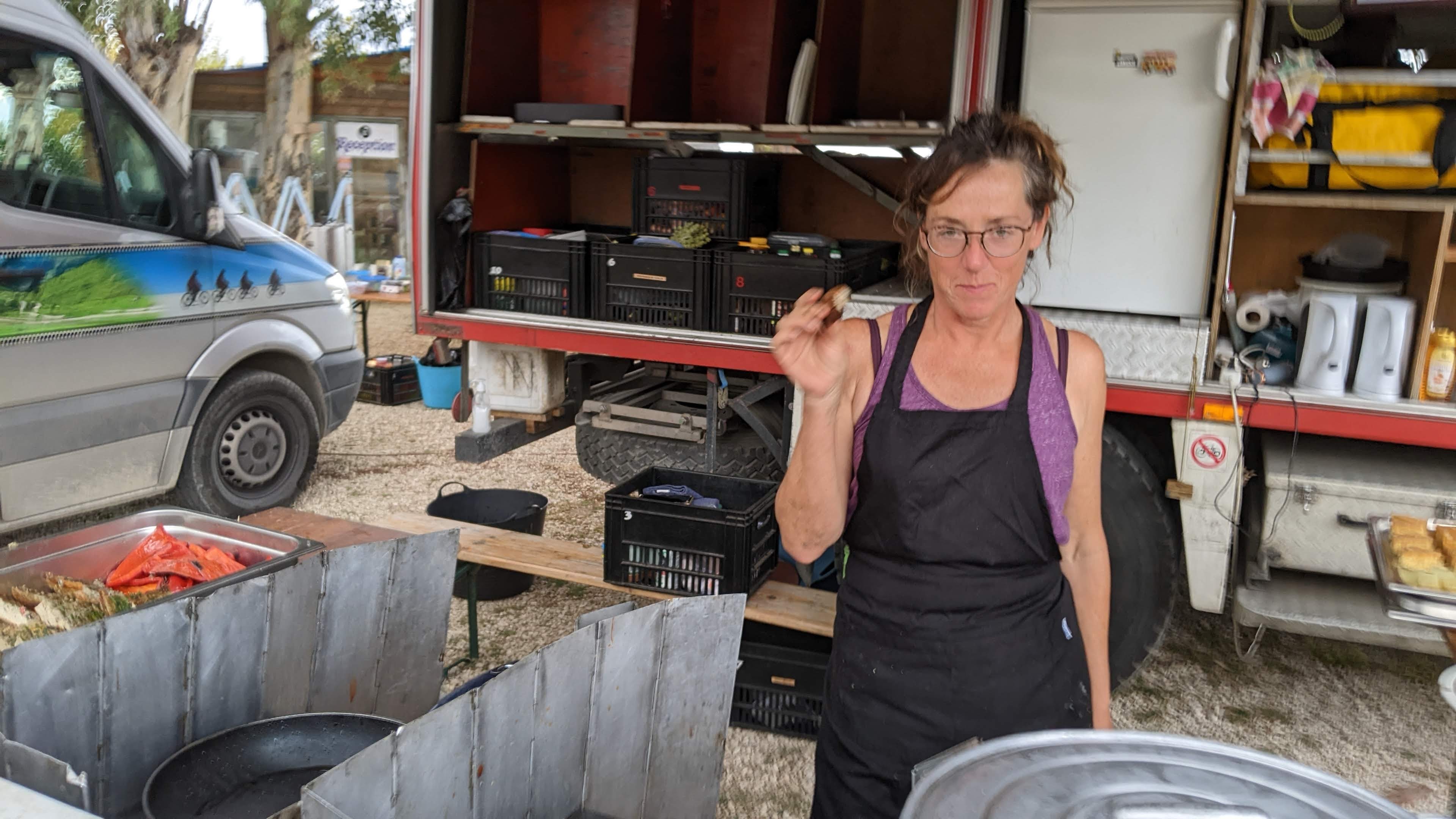 Eventually the trucks arrived with our baggage, the firetruck with our tents last. We had cold showers, washed clothes, set up tents and relaxed chatting for a couple of hours. These shorter days are really nice for relaxing longer after the ride is done.
