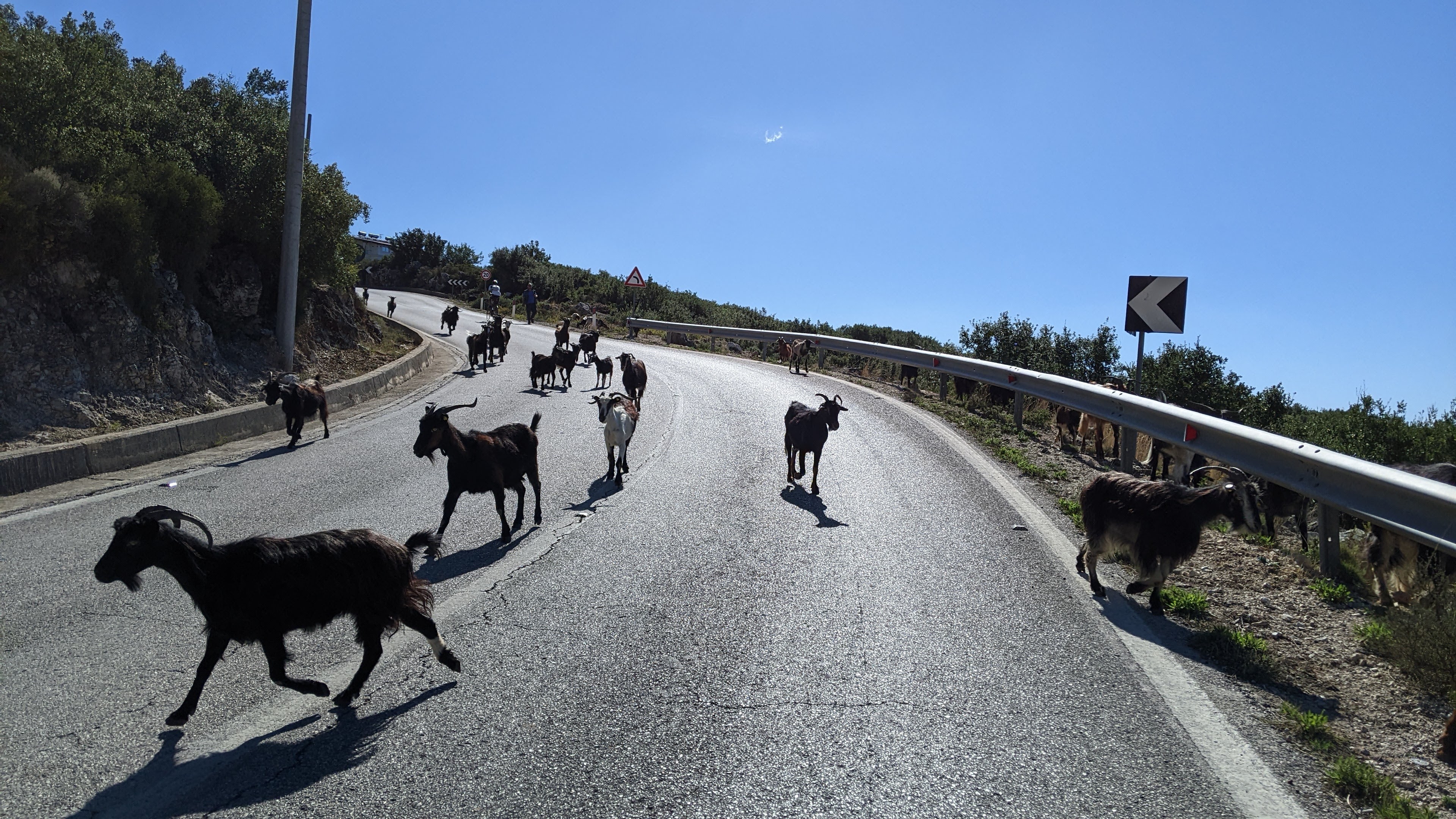 The rest of the day kind of went that way. Lots of long climbs interspersed with short but fast descents. But the scenery! Maybe it’s partly because of the weather: the first time in a week or more that rain wasn’t imminent and forecast to dump. The world just plain looks better when the weather is great. Several times, when descending at high speed, I would be torn from just wanting to stare at the gorgeous sea and islands and shoreline with the super-azure water to having to watch the road. I also liked saying hi to people. One guy called out from his house, “Where are you from?”. I answered, “USA”. “Oh very good!” was the response. This was a big improvement from two days ago when a guy leaned out of a car window and said, “I will kill you” to Bob M.