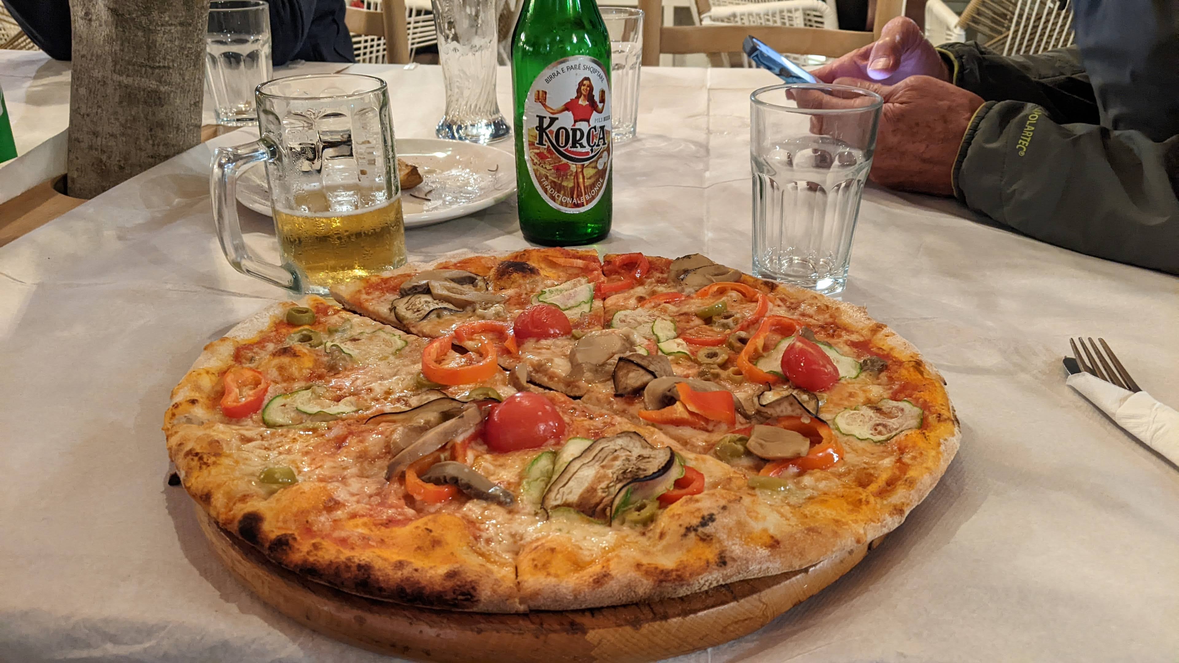 After shower and laundry, I lay down for a minute but soon it was time for dinner. Google showed a large number of good looking restaurants within walking distance. But Sigi and Anita had already checked and almost all were closed. The season really does end September 30 I guess. Five of us went out to the Island Restaurant which was known to be open, and of course found the staff and many riders there. We had a great dinner, huge, inexpensive and tasty. Best pizza on the whole trip so far, made by what looked like a 16 year old boy in a very professional looking full size pizza oven. Liz had a grilled fish, both Bobs and Carien all liked their food and beer.