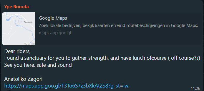 The riding in this area was up and down, on deserted roads, and the landscape was thick beautiful forest. I never saw anything like this in the Greek Islands, that’s for sure. The spot Ype found for lunch was just awesome. He tantalized us by text first: