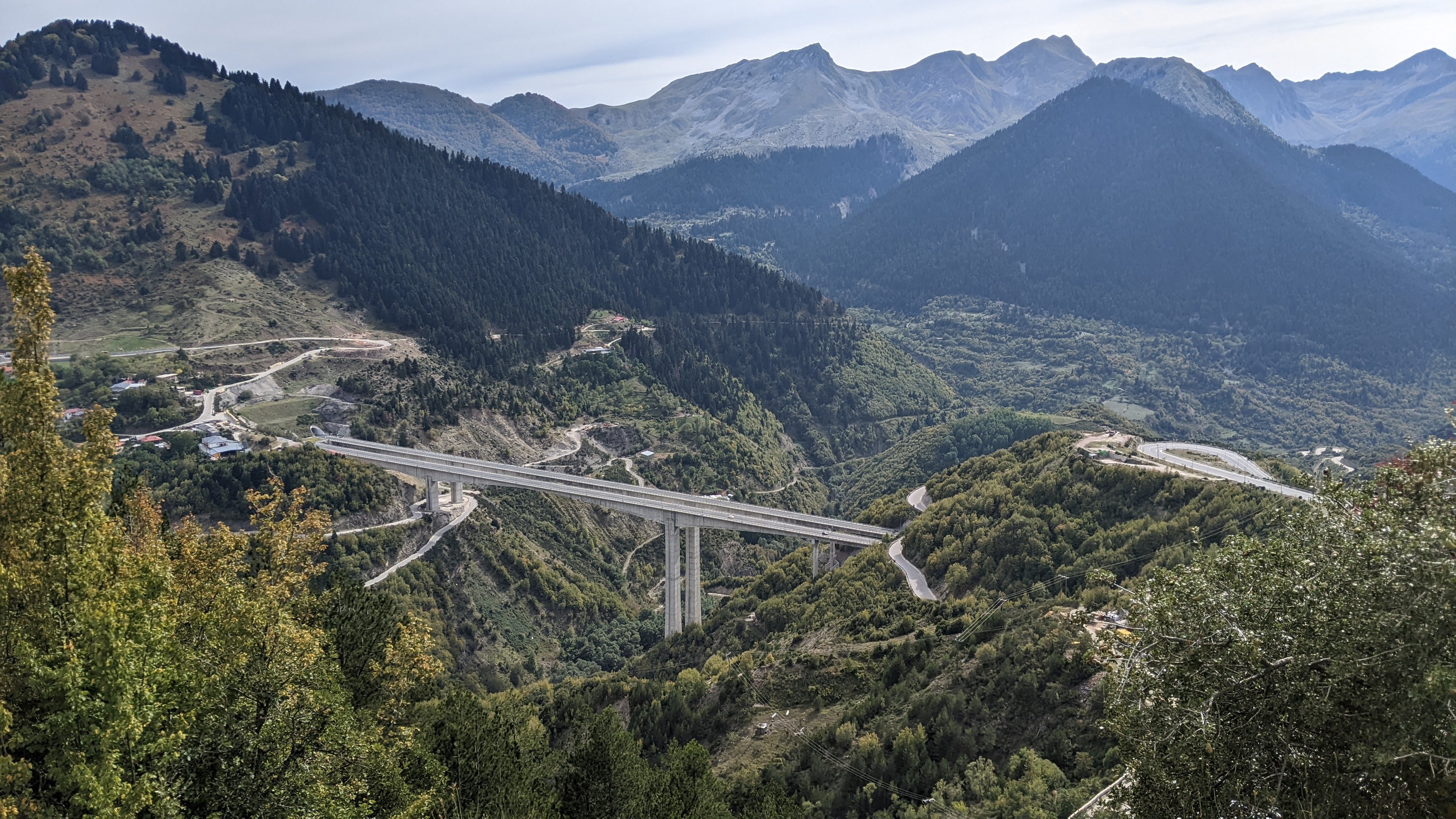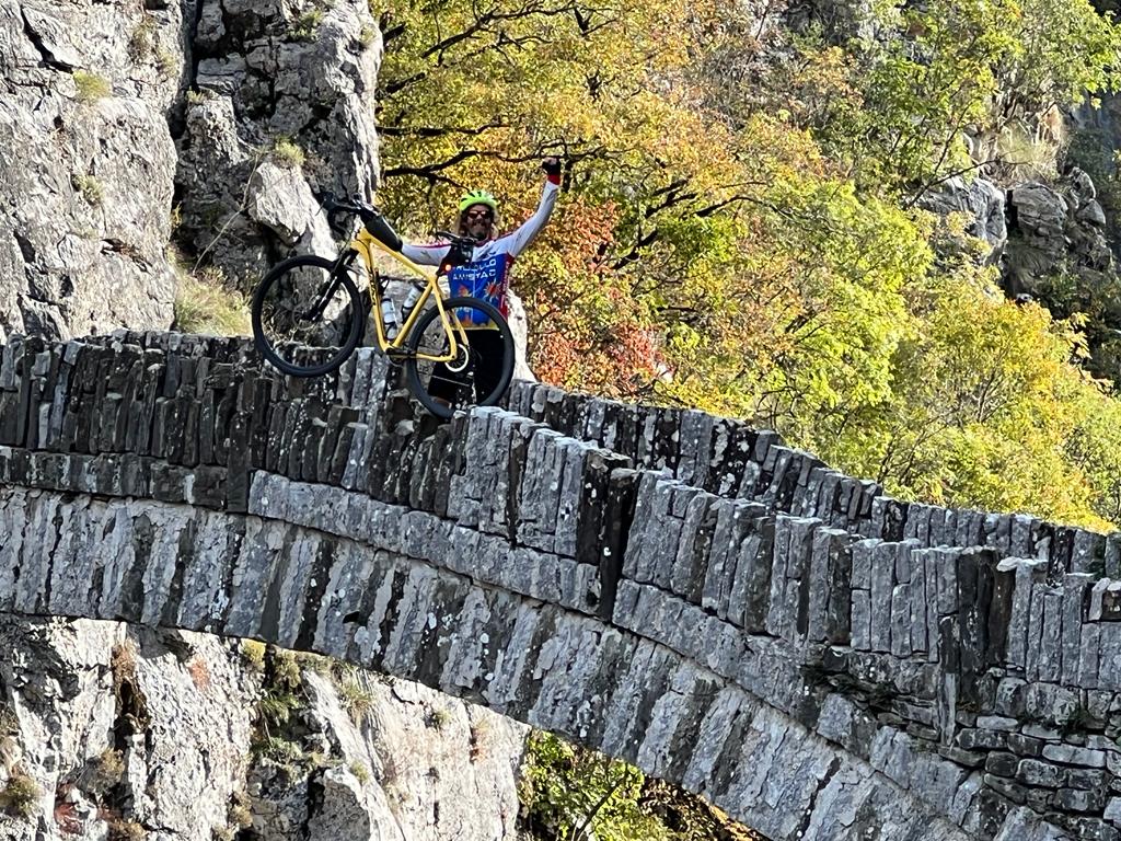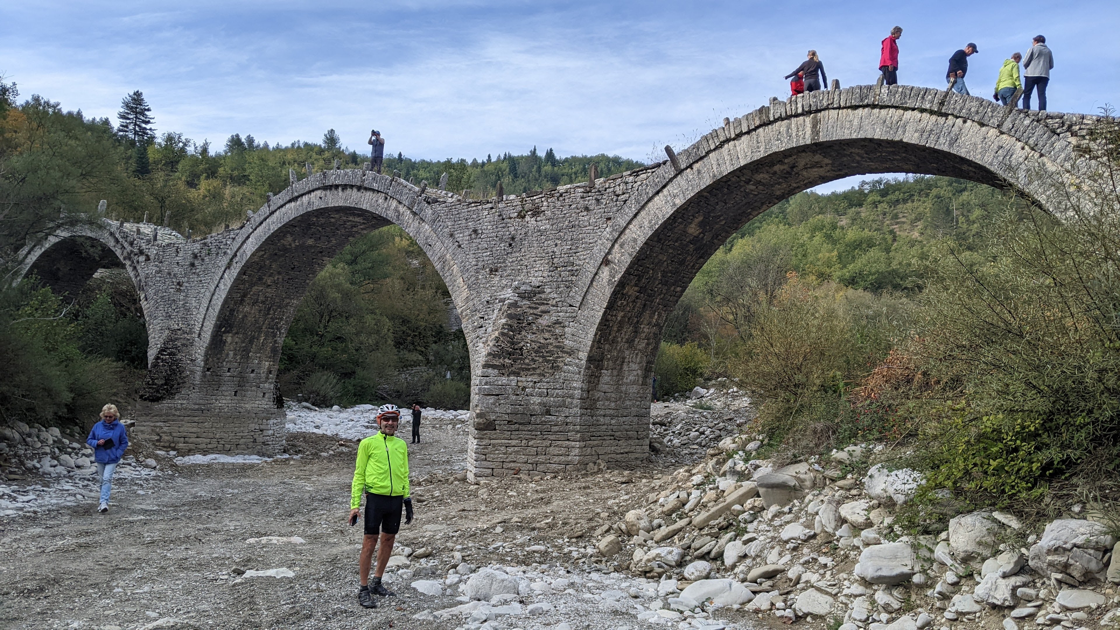 The weather has cooled off quite a bit. It got down to 3°C last night and when we started riding today, a little after 9am, it was 7°C. It didn’t feel that bad so I started with both jerseys on, not carrying anything else. By the time we were halfway down the initial 15 km descent from town, I was starting to get a little cold. At the bottom, I was frozen, especially my hands. We stopped at Noutsos Bridge, built in 1750, and spent some time checking it out, mainly to warm up!