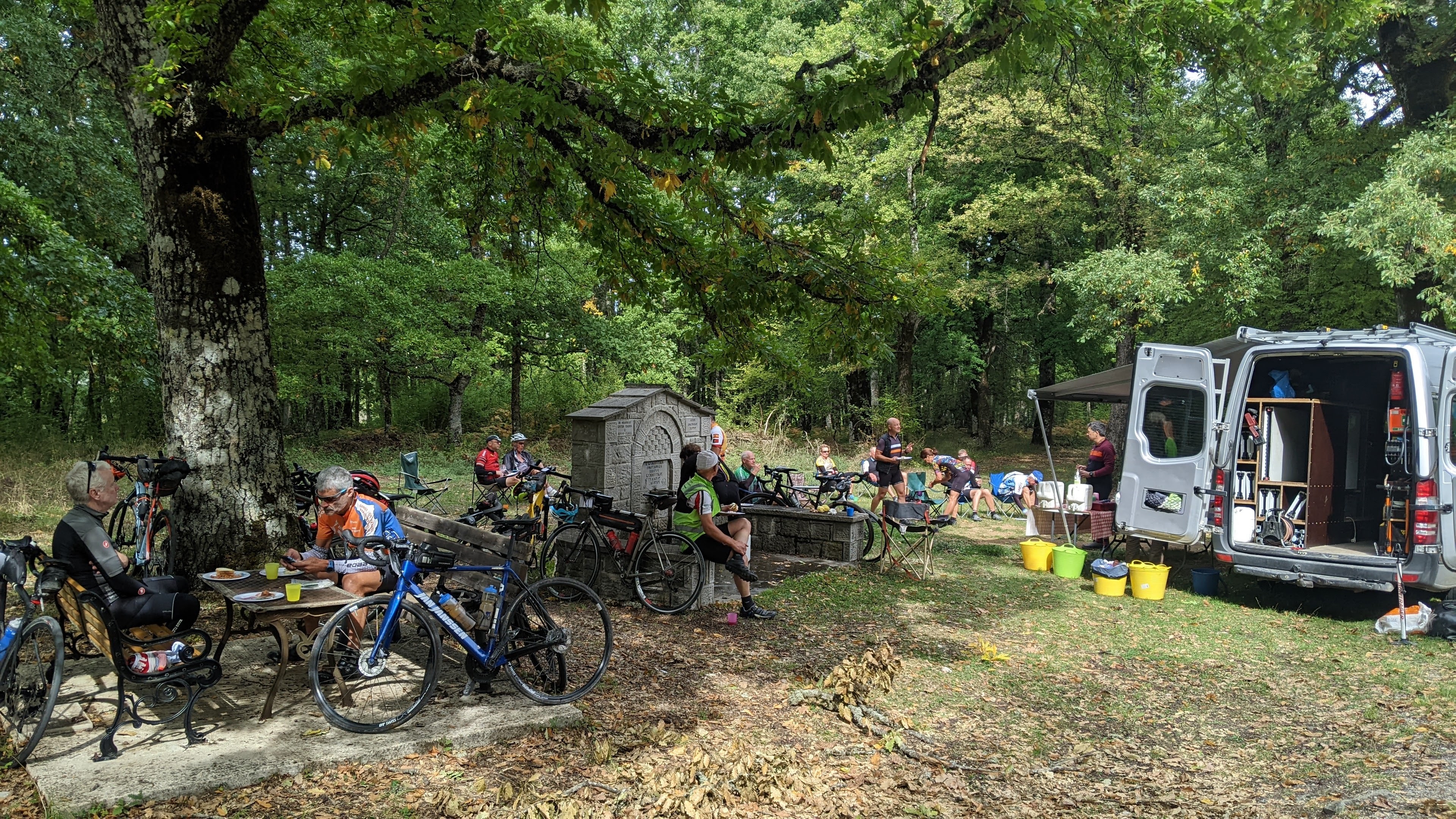 After lunch, Bob and I continued together, up, down and around, through some headwinds and soon came to the major climb of the day, 750m in 14 km. This one was pretty consistent, pretty, with low traffic. It did drag on and the headwinds were intermittent and strong sometimes. By the end I was feeling somewhat unpowerful.