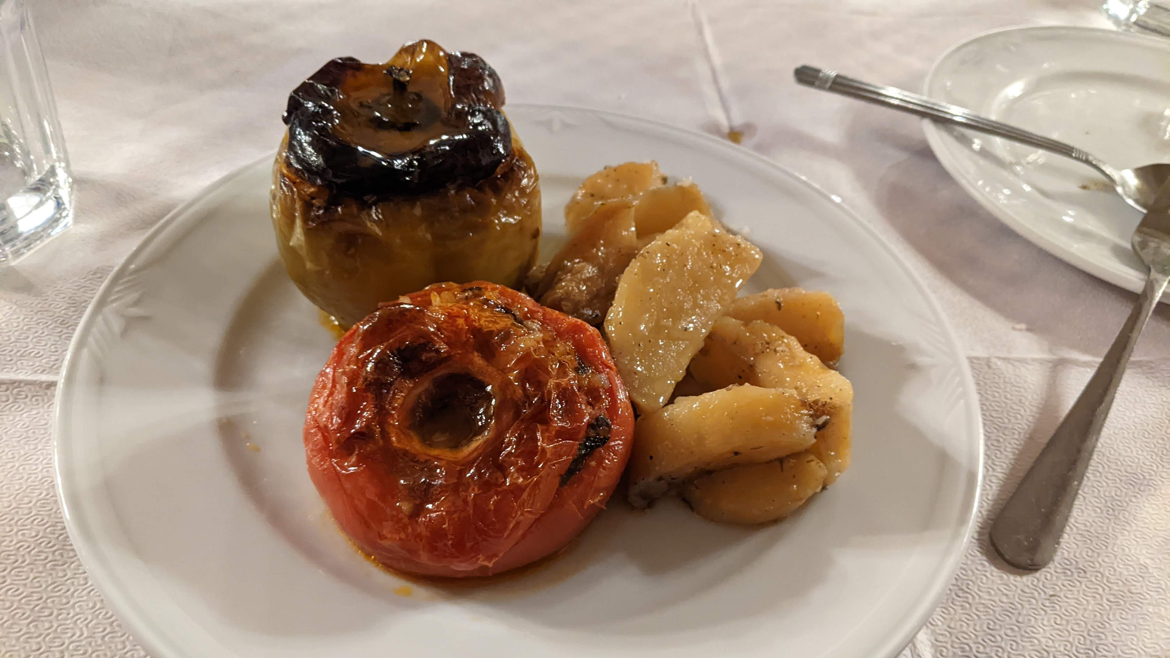 By 7, it was dinner time so we walked a few doors down and ate. The menu had only meat dishes so Bob asked about other options. The guy said, “Vegetarian or vegan?” and we knew we were ok. I had a great salad and stuffed vegetables – delicious and filling. We had mineral water to drink and since I had just one beer at the previous place, I scored an AFD by Peter’s bike touring rules.