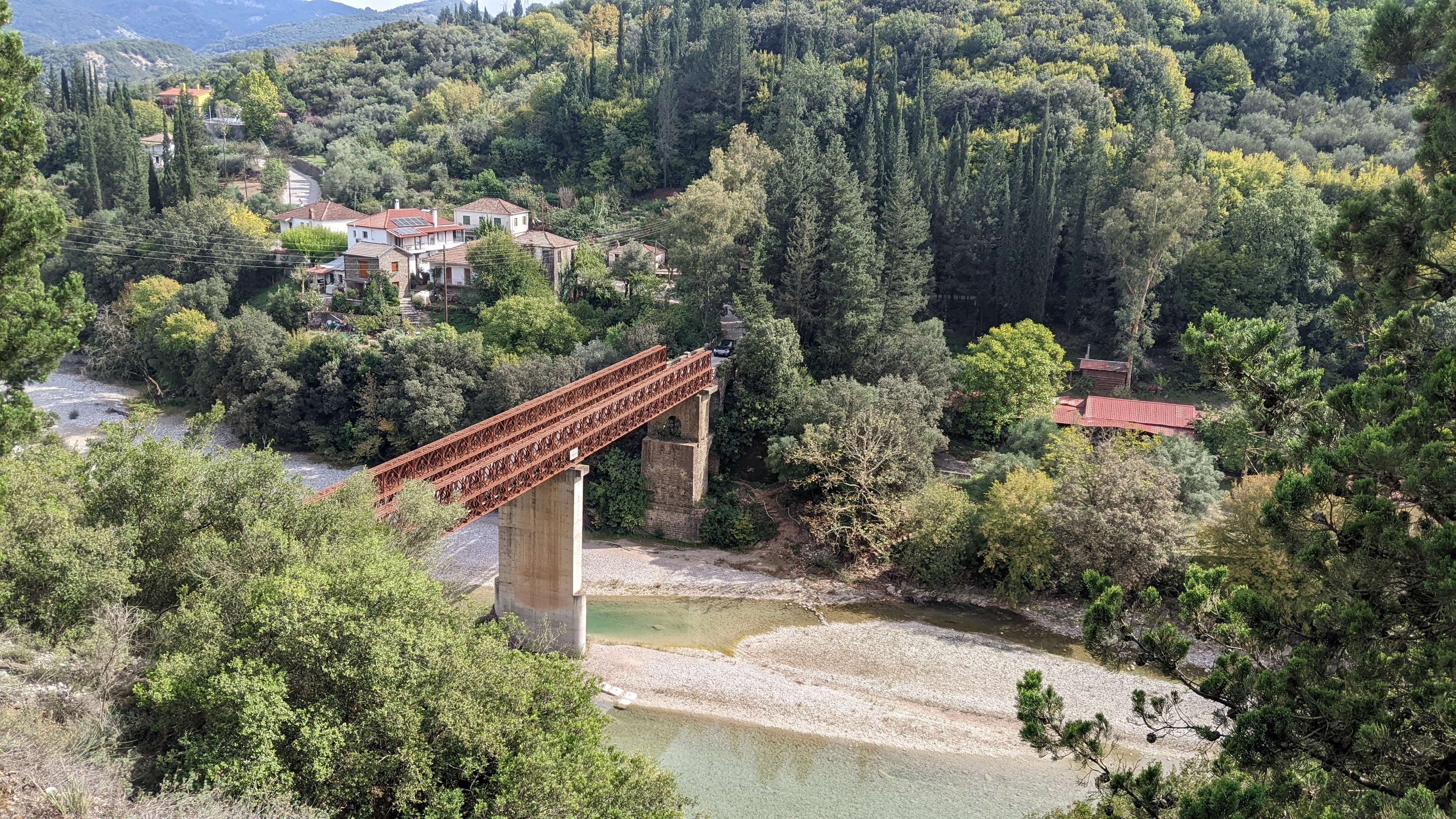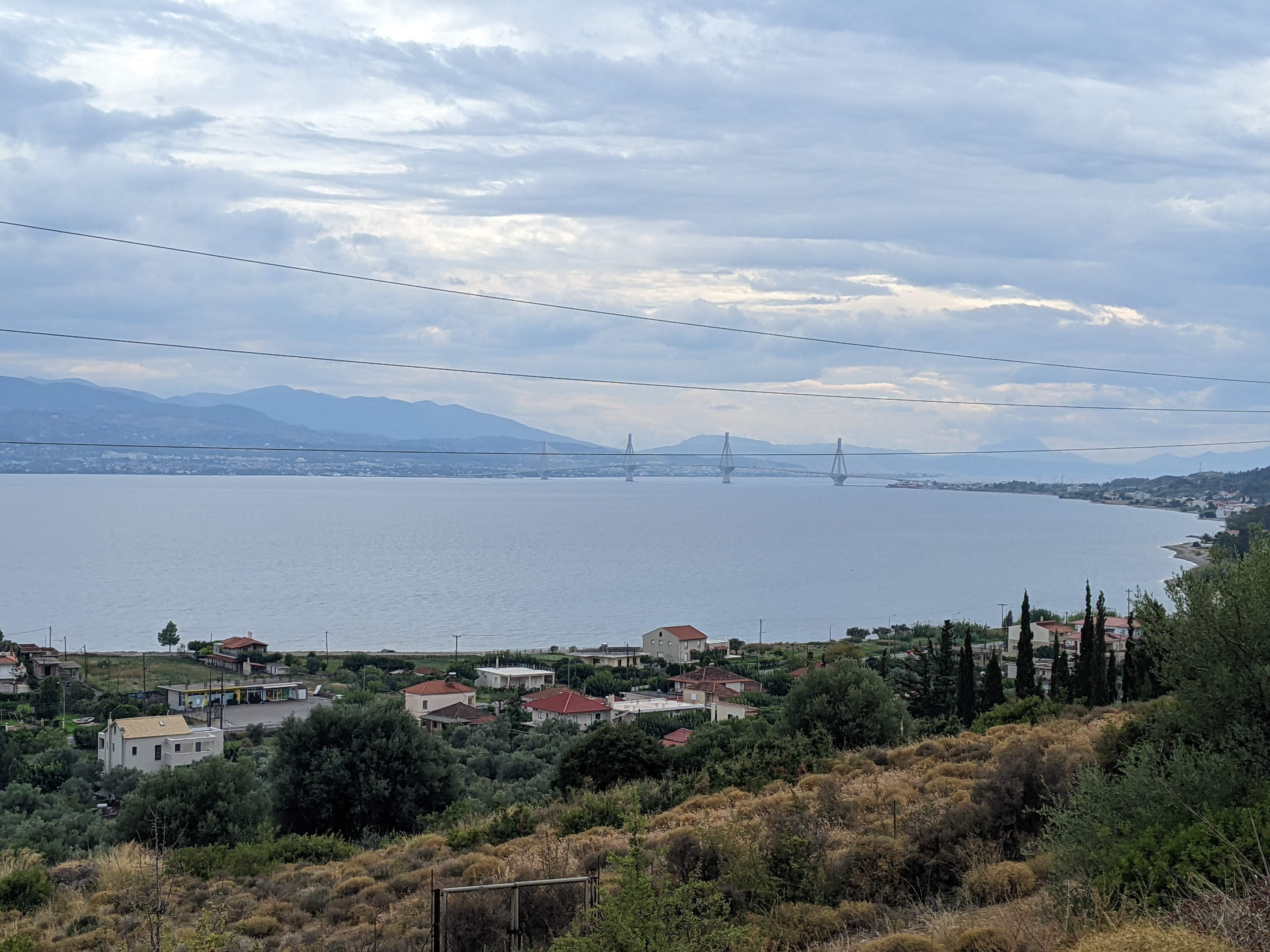 By this point, we were within maybe 30 km of Patras and started to be on the lookout for water (the Gulf of Corinth) and the bridge we’d heard so much about. After another 5 km climb, we could finally see it.