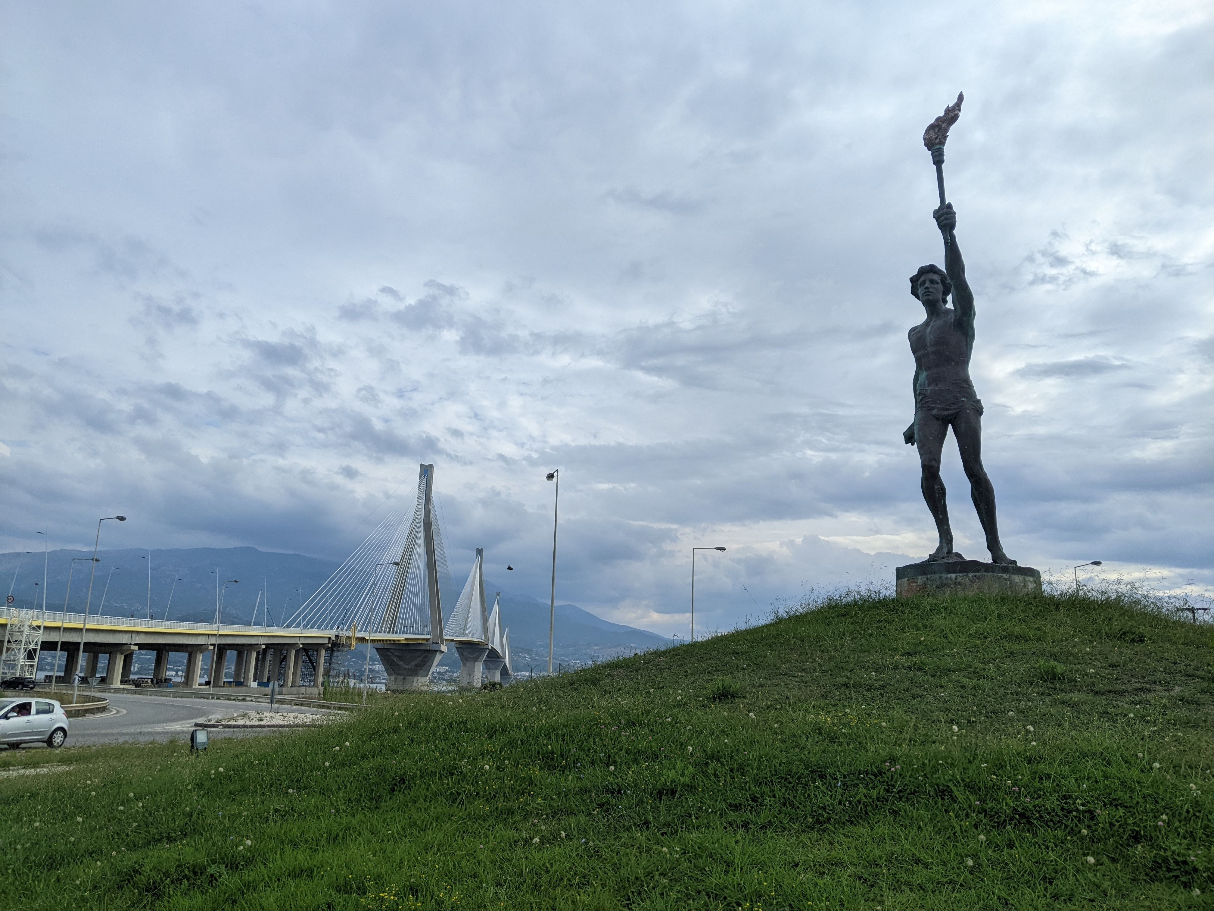 We made quick work of the few kilometers to get there and soon found ourselves under the bridge at a statue of a runner carrying the Olympic torch – the bridge was opened the day before the 2004 Olympic Games and the torch was carried across it then.