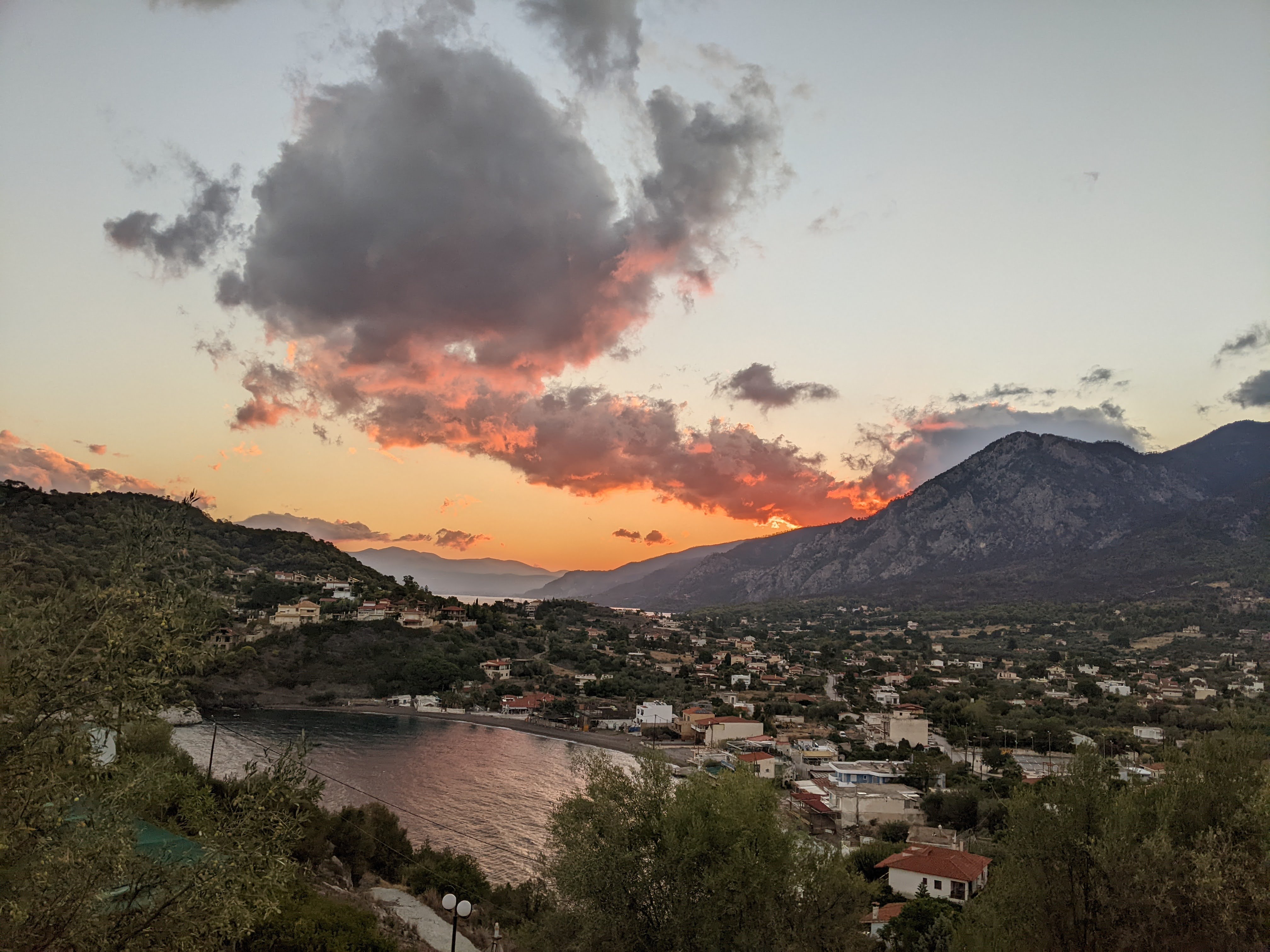 The descent was magical. It was a somewhat twisty mountain road and had sharp corners so it wasn’t particularly fast, but it was so scenic, smooth and the opposite of all that climbing we had done during the day. We were all stopping along the way for photos – in addition to the mountains, the gigantic city of Athens was visible in the distance.
