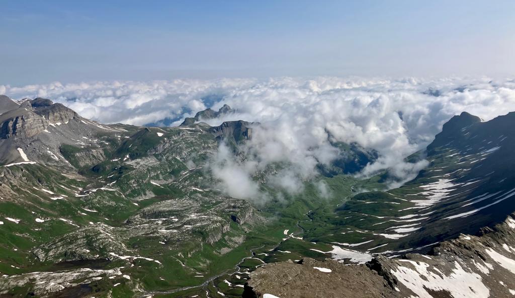 It was a first for us: we got up and took off WITHOUT any breakfast! It was really exciting to see blue sky and the best views yet. We walked the 5 minutes up to the cable car station and took a 15 minute ride up two cable cars through the clouds to the summit of the Schilthorn (2970m).