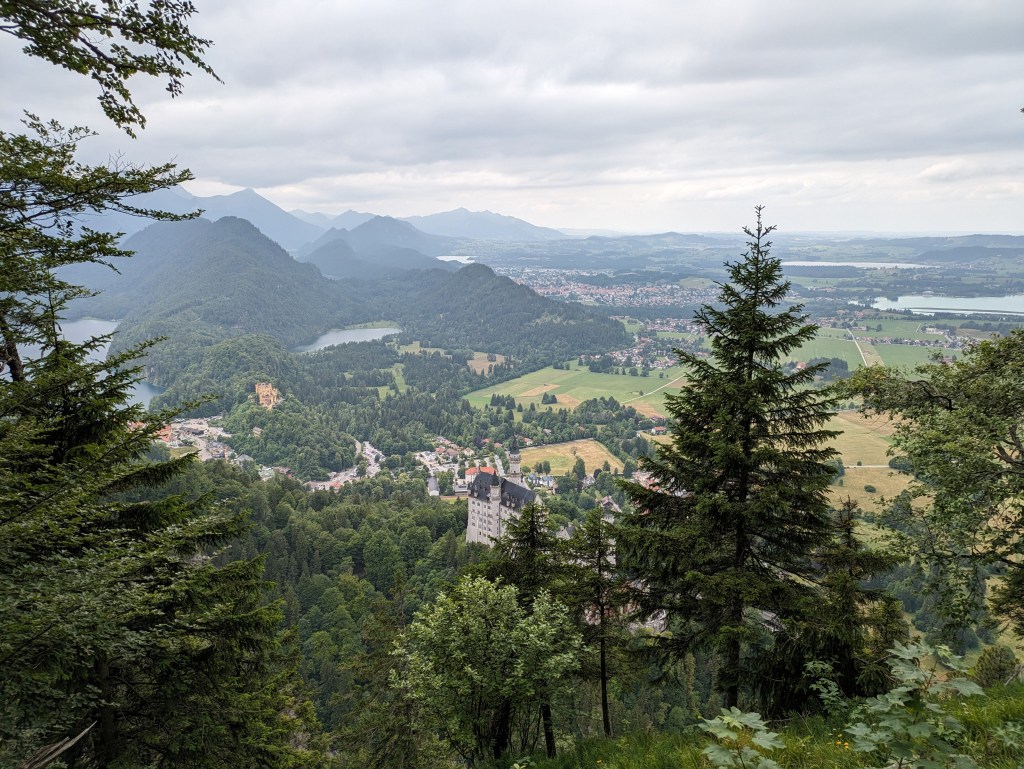 Next up was Castle Neuschwanstein, maybe the most famous castle in the world. We hiked up quite a bit to get behind and above it for some incredible views. There’s a bridge which was so crowded it had a video sign telling how many people were on it and how many more could fit (max of 200, always full). It’s crowded because the view from it is just amazing. We took the obligatory selfie, then headed up the trail for some higher up views of the two castles and the surrounding ex-fiefdoms.