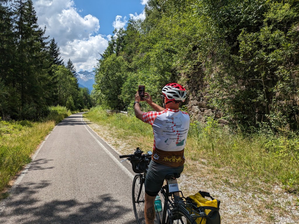 We had heard that the 32 km to go after the pass was up and down but it ended up being the most gorgeous, continuous, smooth and perfect downhill ever. The bike path is really just perfect. If we had paths like this in the US, cycling would be so much more popular! It was a dream descending. Fabio and Nathan raced a guy on an e-Bike and won soundly on a section Nathan had unicycled in 2012. Everyone was having fun. Some people had taken the train up, either all the way from Innsbruck or from a higher station, but you would not want to miss this descent for anything.