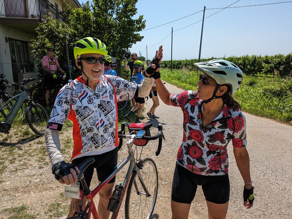 Our second-to-last riding day was pretty much all flat, and hot. It was on a bike route that was partly bike path, partly roads. We had gravel sections including one with a challenging tunnel with a steep incline at the end that caused Greg and Katie to have slow speed crashes. Post-crash celebratory high-five is shown in the photo. Along the way we saw a farmer irrigating his crops and lots of interesting old and new houses.