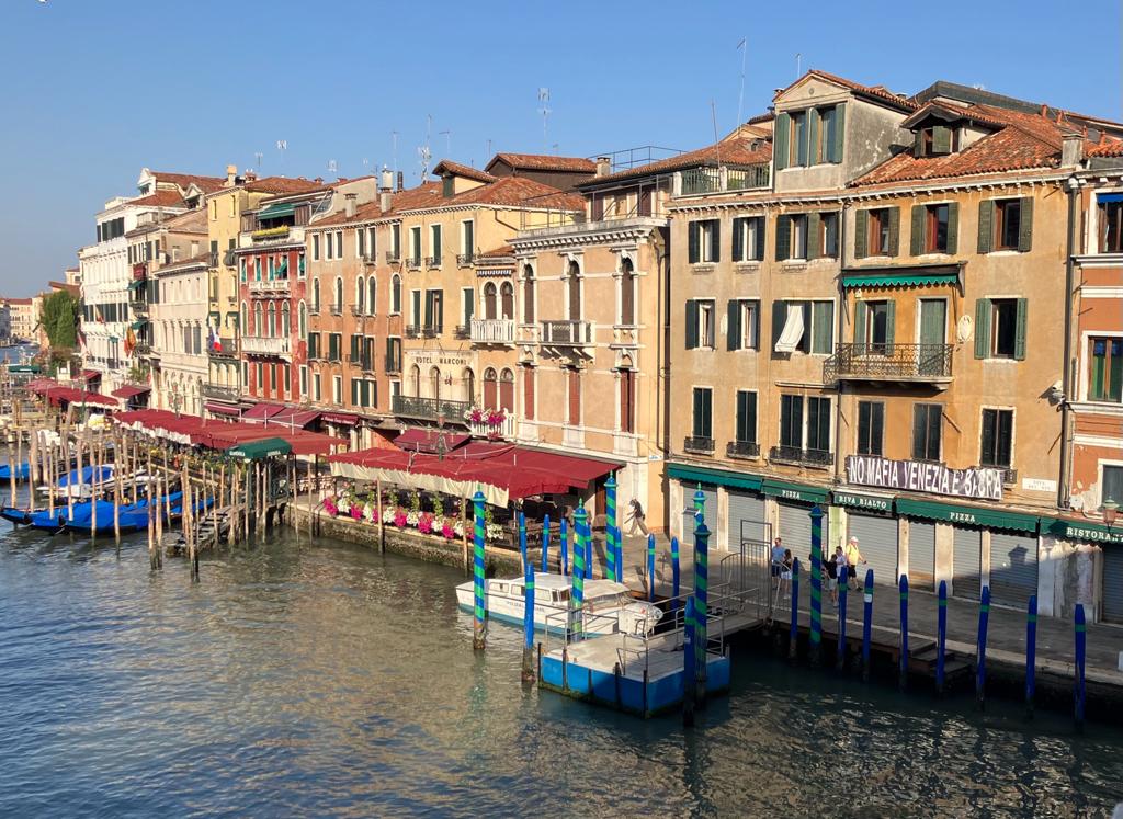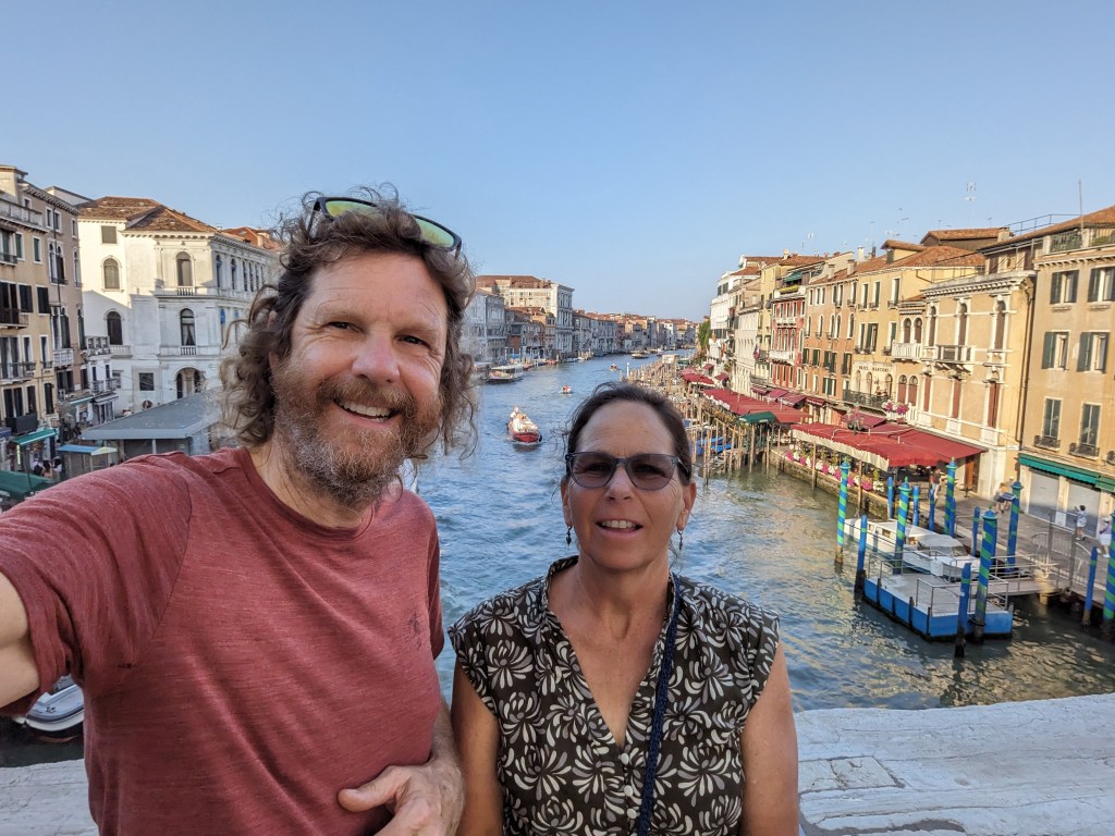 The next morning most of our friends headed home but we had an extra day. Since it was still hot and humid we got up early and took a water taxi at 6:30 to Venice. After another look at the Piazza San Marco, we walked through many tiny passageways, looking at shops and sometimes having to turn around at dead ends. We found ourselves at the Rialto Market and wandered through the fish area. We crossed the famous Rialto Bridge where people line up for a long time in crowded times for a photo; we had it almost to ourselves. We stopped at a sandwich shop for breakfast and Nathan discovered a great drink: Moretti Limone, a very low alcohol (1.3%) radler, delicious.