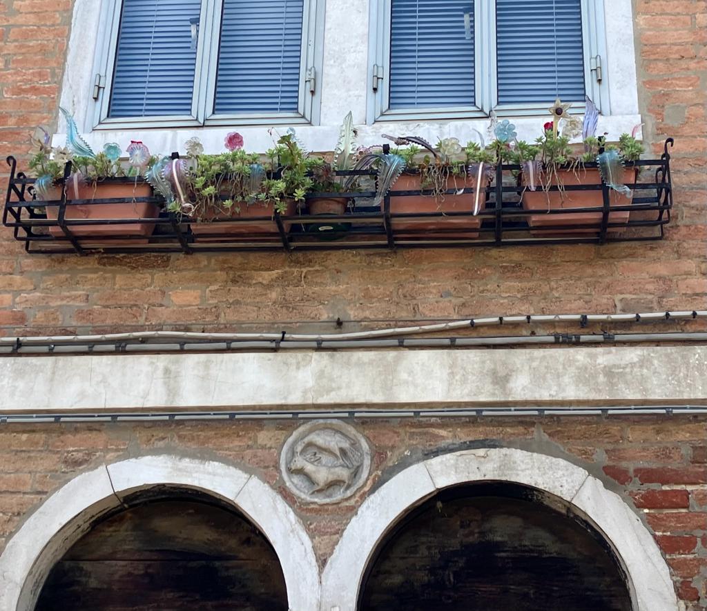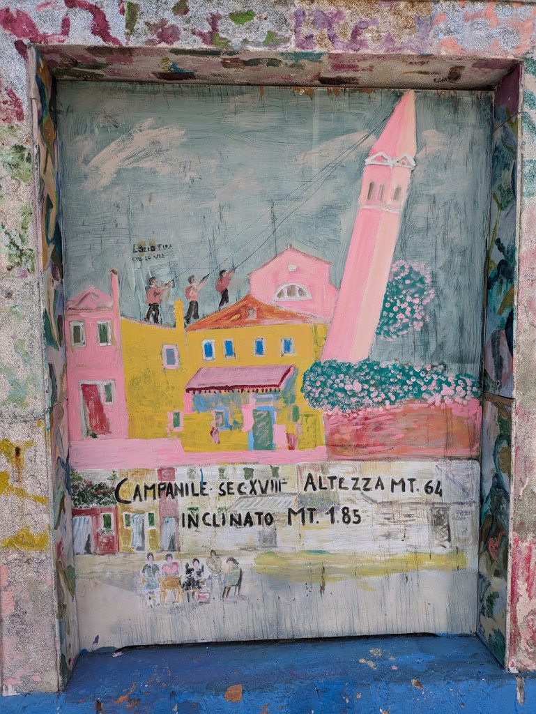 It was getting really hot so we decided on an easy afternoon activity: take the water taxi to another island, Burano, famous for lace work. The ride was an hour and lunch was the first order of business when we arrived. We found a place with air conditioning inside, and after lunch with cold beers, we checked out the small town with its brightly painted houses. We saw the famous leaning tower – it really leans a lot but photos don’t show it somehow. We looked around in some lace stores and loved one special vintage showroom. Some of the pieces take months or even a year of work. After a little shopping we headed back – the heat was just too much.