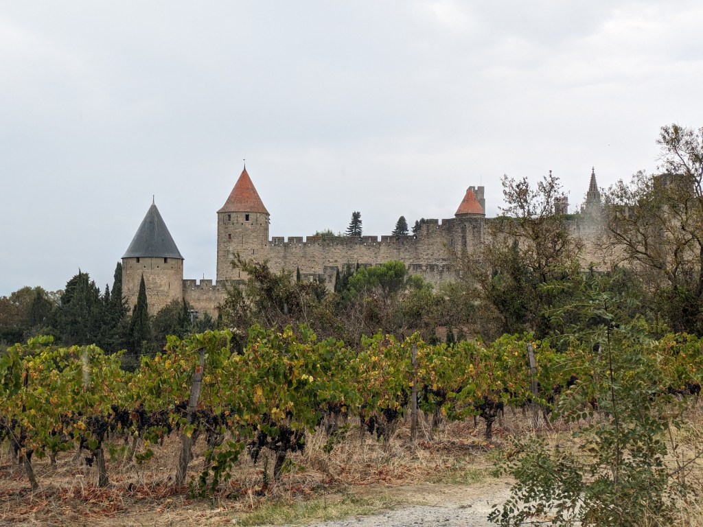 Then there was a climb, up over 600m and right at the top Ype was parked with lunch. It was cloudy with rain vaguely threatening. But the few times we had actual rain it was light and didn’t last long. The ride from lunch to Carcassonne was short, only 46 km, and mostly downhill. A bunch of us were cruising together but Wytze put down the hammer about 10 km from town and it was hard to keep up. Daniel flatted and so only three of us arrived together. It was so amazing. I’ve been seeing the photos and wanted to visit for 20 years and LOVED seeing it in person. Even our first view from a few km away was great.