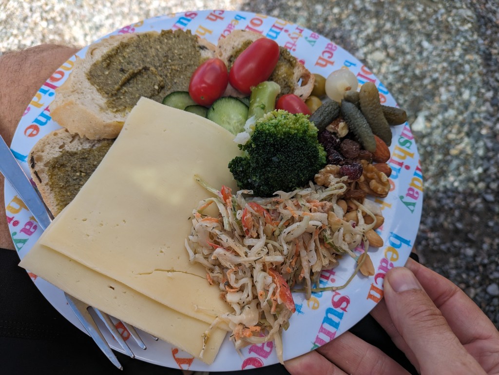 A little later we turned off and started up the first hill of the day. 18 km long and climbing a lot. This might’ve been our steepest climb yet and it was really humid from the rainfall. I was sweating up a storm but just cranked it out. I had a couple of stops for food (including blackberries), then was on top. After a short level section, the second climb started – I did it with Daniel who was sick, and Wytze. We topped out at over 1700m and Ype was right there with lunch.