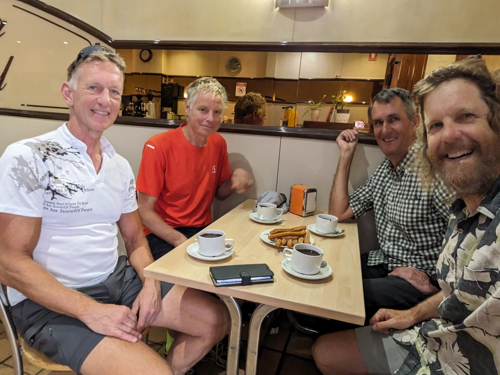 Wytze, Andrew, Bart and I headed out by bus for downtown to find breakfast. Near the center we had coffee (I had chocolate and churros), just great. The chocolate here is even thicker than I remember from other places in Spain. Like thick pudding. The churros weren’t great though so we headed a few blocks away to a real churreria. We passed a furniture store with a nice bed with lots of pillows on display. Wytze said, “I think I used to know what that was…” Chocolate and churros for everyone at the Churreria. Better but still not as wonderful as in San Sebastian. It’s good to have things to look forward to in the future.