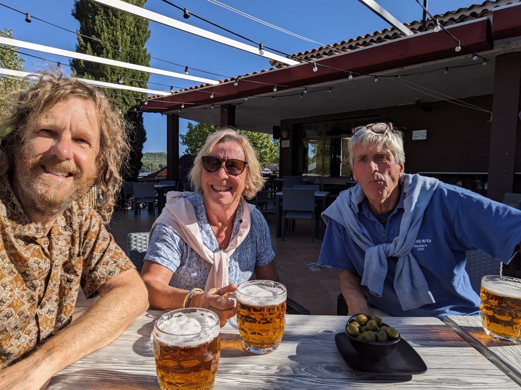 We rode that last 20 km, not in the van. The campground is huge, as in we are lucky to have bikes to get to the showers and bar. Anyway, I set up my tent, ate soup and snacks, then rode off to the showers. While I was showering I heard a voice, “Mr Hoover is that you?” It was Dick Prent, my good friend I originally met in La Paz in 2019. He is joining us here for the rest of the ride to Dakar. He showed me the glamping tent he’s sharing with his wife, Anke, who is here dropping him off. We headed straight to the campground bar and had beers and olives and great conversation until it was time for dinner.