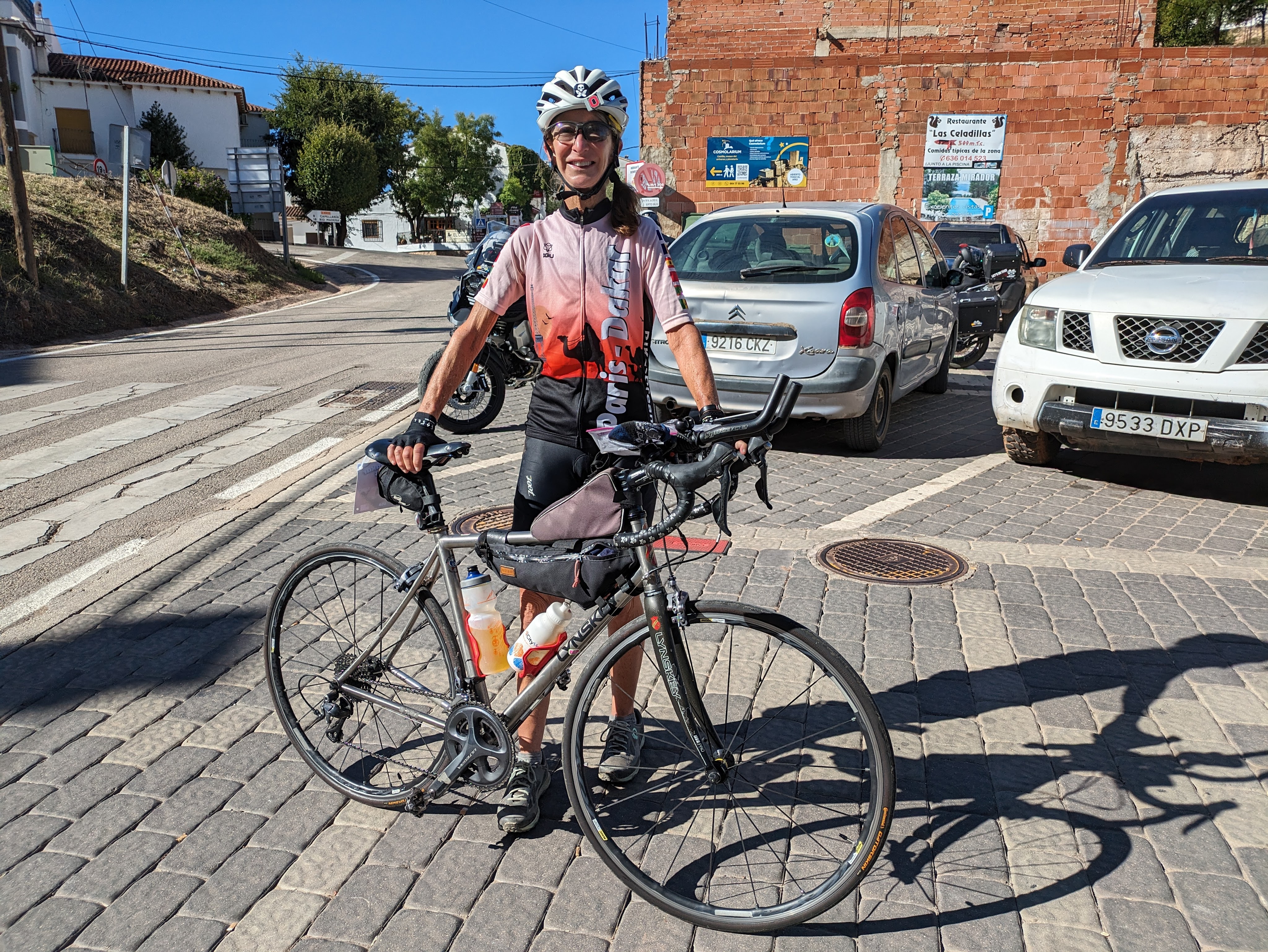 It’s a Lynskey titanium R150 with 25mm tires. Gears unknown, I think the best climbing gear is a 32 or maybe 34 [doesn’t matter to her, she just goes!]