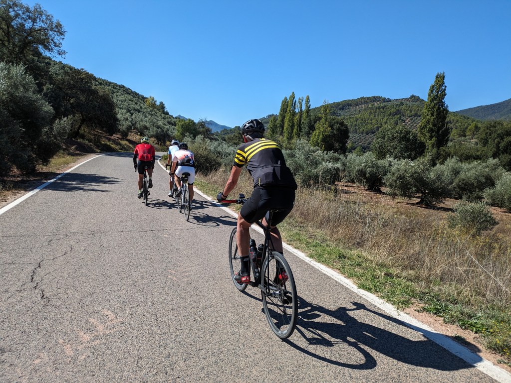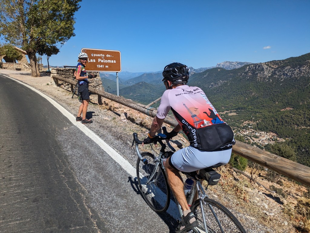 After riding up to the campground entrance we turned right and immediately the climb screen popped up on my Garmin telling me I’m starting a 12 km climb of 659m. But the air was cool and I really didn’t mind it. It was beautiful at the start and only got better. I was proud to make it in just under an hour, even though I was going easy, conserving leg power for another long day. At the top we were up over 1400m again, with long beautiful views. This part of Spain is just great.