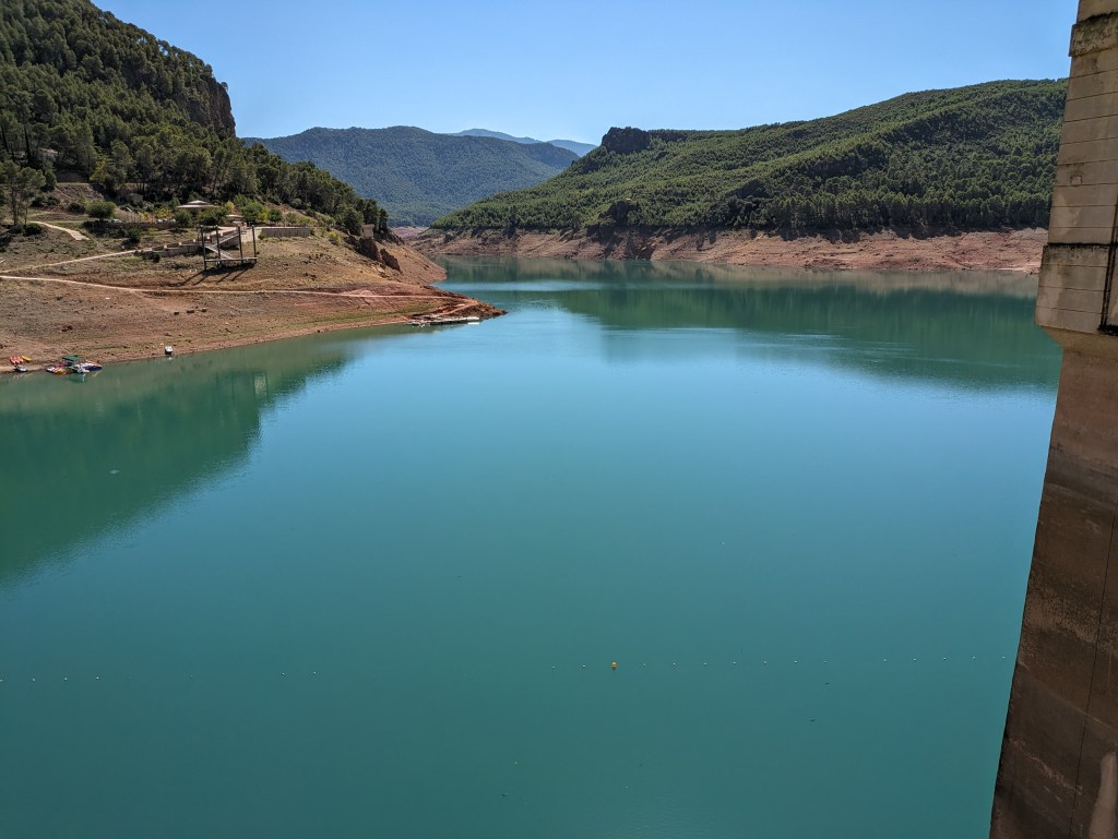 Finally it was time to go, more downhill to an interesting dam holding back a lake that needs more water. The route then followed the lakeshore but up quite a bit, and partway through we found lunch at 66 km. It was getting hot now, sitting in the shade was vital. And I did not forget the electrolytes! The only sad thing was Dick’s derailleur breaking – Ype went back to rescue him but he will not be able to ride tomorrow’s stage.
