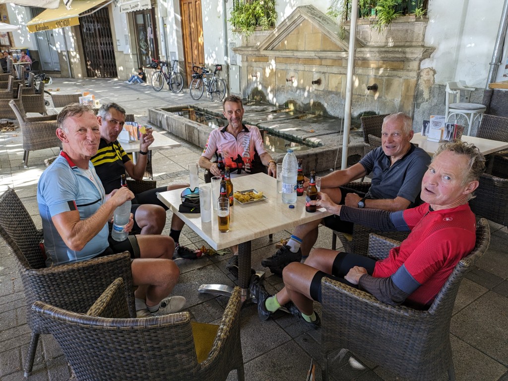 We had several more climbs and lots of glorious downhill as we made our way along the route. Ype texted and said he was only going 25 kph so don’t expect lunch before 1pm. We came to a small town with a fun looking bar that was open and did as he said, took our time. We had a few rounds of refrescos, relaxing on the deck.