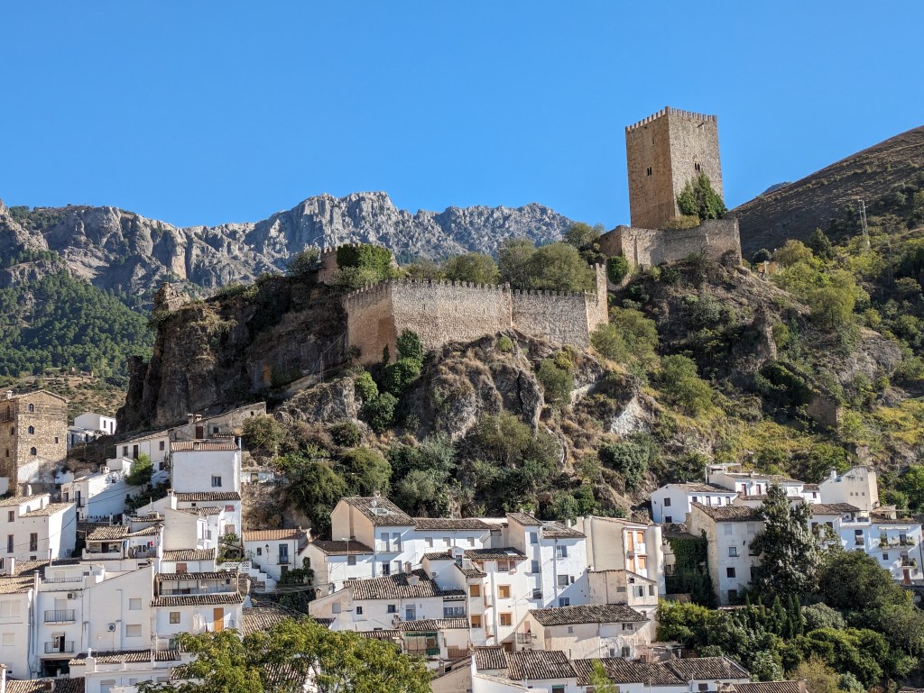 We went partway down the descent but noticed a fancy looking hotel with an amazing view. So we pulled over and ordered a round of Clara (radler – beer mixed with lemon) which came with a very yummy snack: big balls of potato/tomato/onion/salted fish. It was so cool and wonderful looking out over the valley, olive trees growing everywhere. We ordered a second round and it came with Spanish cheese with olive oil dribbled on top. Simple but delicious.