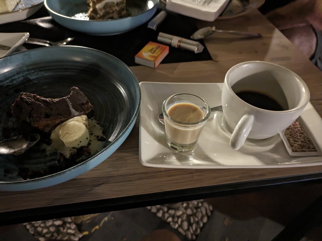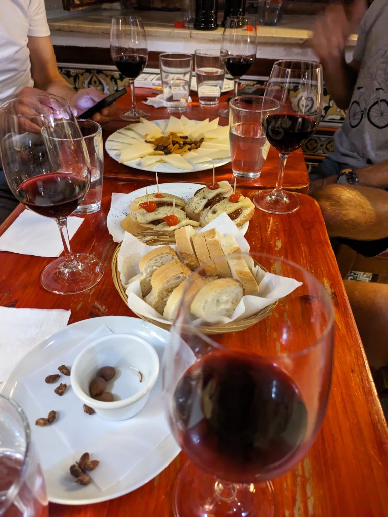 About 7, we started walking over to a wine bar Wytze had found for dinner. It was a 30 min walk, through a touristy area. We hung out until 8 at a nearby outdoor café having sangria. Daniel arrived and we moved into the wine bar, a tiny, very local place. Each bottle of wine came with an amazing dish of food, like oysters, toast with shrimp, etc. Ype joined us after a couple of bottles and spent the rest of the evening with us. After four or five rounds, we walked to a nearby square for dessert. We had I don’t know how many desserts, tiramisu, chocolate cake and a bunch of orders of cheesecake (although it wasn’t on the scale of the legendary one from Zaragoza). Then we started with the drinks. First there was coffee with your favorite liquor (mine was Bailey’s). Then some rounds of “Vino dulce” which tasted like Port – excellent. Finally, well after midnight, we called an uber which took Bart, Andrew and Daniel home while Ype, Wytze and I walked. When we made it back to the hotel we chatted in the lobby with a few of our people still awake and at 1:30 I went up to write this up. What a day! It’s like two days in one, one of riding and one of pure fun in Granada. And the rest day hasn’t started yet!