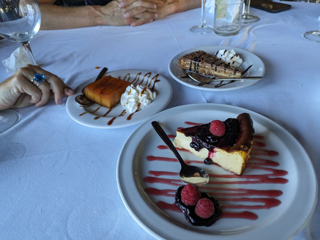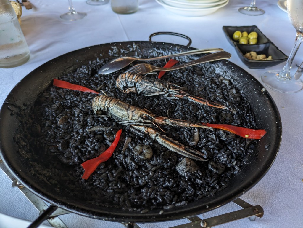 We had been working on this plan to have a real Spanish paella meal before we left the country and it did not disappoint. First came several rounds of appetizers. The most interesting was fried anemone, a local delicacy. I had always wondered if anyone ate these and finally found out. Also tiny squids and others. Then the main courses: two types of paella: one with black rice and seafood (squid ink colored) and the other more traditional with giant shrimps. Both were off scale in taste. All of this was washed down with three or four bottles of delicious white wine. And luckily Jan started with a couple of rounds of beer so the rest of us got more of the wine. Dessert was of course cheesecake, plus a couple of other delicacies. This cheesecake was either the second or third best of the trip, simply excellent. Then coffee with brandy to top it off. Wow, I guess this is our farewell to Europe meal, for a while. Incredible. I will never forget it.