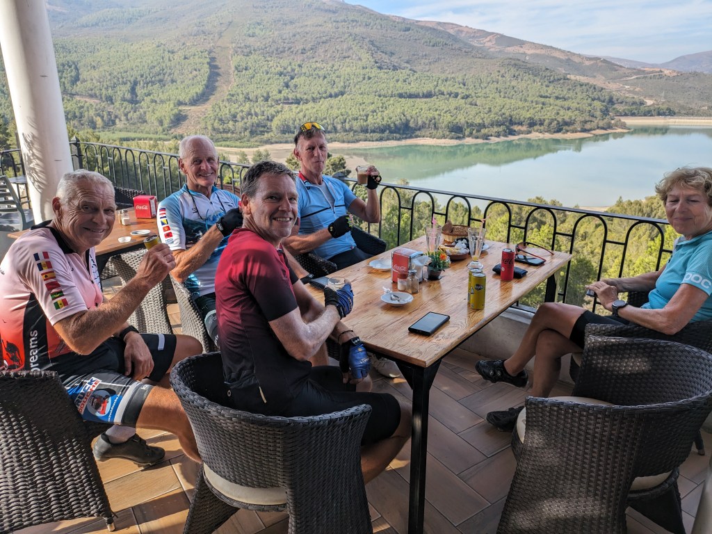 There was lots of traffic as we headed out of Martil. It didn’t feel right without Andrew and Wytze. It got hotter throughout the day, and stops for cold drinks became more and more vital. The first was at a nice place called Restaurant Panoramique. We talked to the new owner who built the big deck that looks out over a lake. Drinks and snacks were great there.