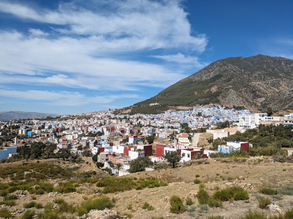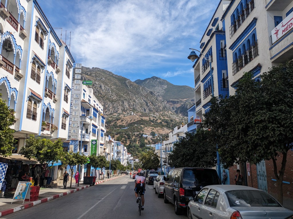 We headed out in a good sized group, cranking up yet another hill through construction zones and pretty nice scenery. I really liked the people we passed, they were so positive, adults and kids. Our group split at an intersection. Daniel, Jan and I continued up a very hot climb to the famous “Blue City” of Chefchaouen. First up we needed shade and drinks. We got off the road into an inner courtyard and found a perfect bar. We drank long and hard, multiple sodas, lots of water plus fresh squeezed orange juice. Each of us had over a liter and there was no hint of peeing.
