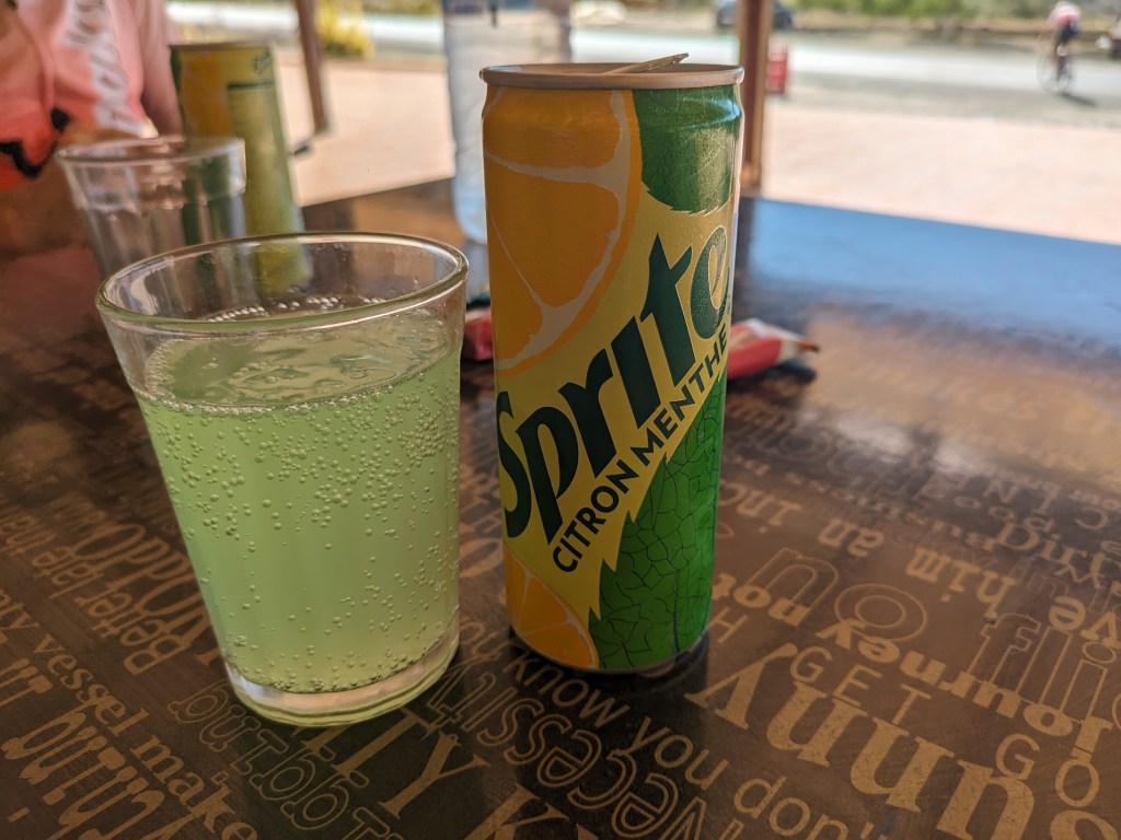 We had around 50 km to go, a little daunting, but there was lots of fast downhill. We ended up stopping part way up another brutally hot hill, for more cold drinks. The new one was Citron Menthe flavored Sprite. It must be made specially for the Moroccan market as they love mint here so much. It’s quite good on a day like this (understatement).