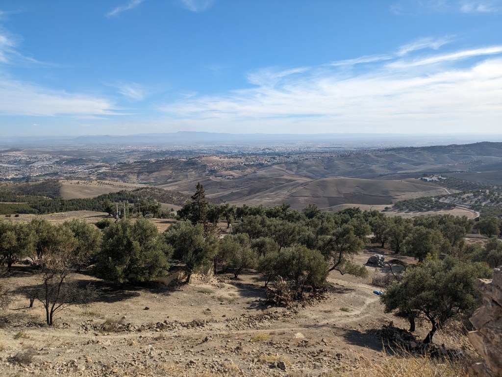 We rode down to the outskirts of Fez together, then the last 6 km through town, on big wide streets with lots of traffic. There were many roundabouts with traffic lights. That seems to defeat the purpose, but I guess it works. Soon we pulled into the hotel and that was an awesome moment. There were bikes out front – no locks required as they are guarded 24×7. I didn’t check in, just went straight to the snack room for sandwiches, coke and many other snacks. I got my room, lonely without Andrew. After a shower I went to the bar with Dennis and bought beers! Yes you read that right, beers!