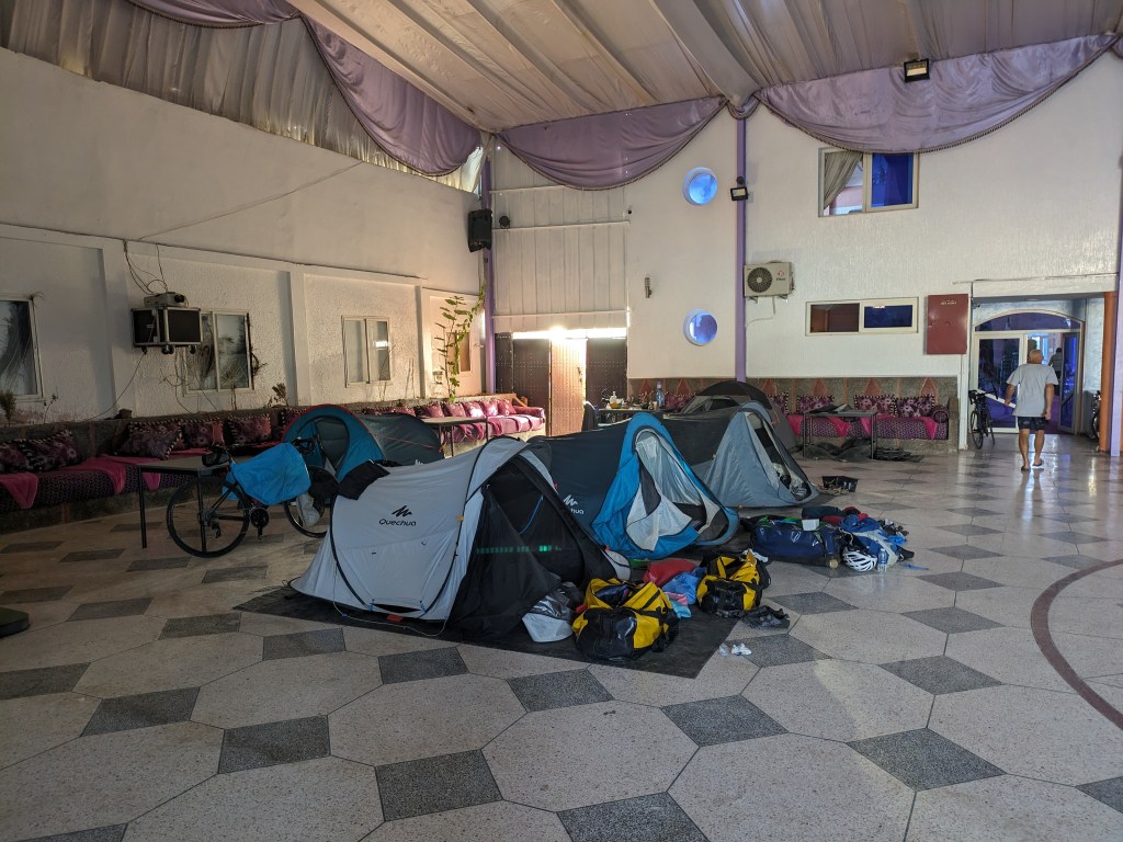 We pulled into the campground, just short of the town of Tiznit. It looked deserted and several others came up saying they had already looked and saw nothing. But a campground guy pointed on, so we went on, turned a corner and there were the trucks and a few tents. It turned out there was a giant wedding hall where we could indoor camp. So we moved in, had snacks and soup, then a hot shower and a relaxing rest of the afternoon. When nothing goes wrong and you don’t need any support, picking your own rogue route is excellent fun.